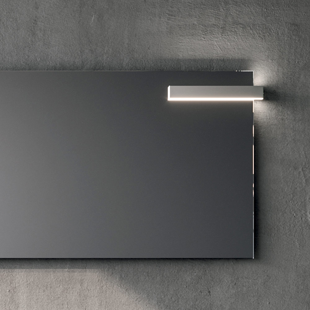 Der rechteckige Spiegel mit LED-Beleuchtung sorgt für gleichmäßiges und funktionales Licht, perfekt für alltägliche Aktivitäten, und trägt gleichzeitig dazu bei, die klaren Linien und die Tiefe des Raumes zu betonen.