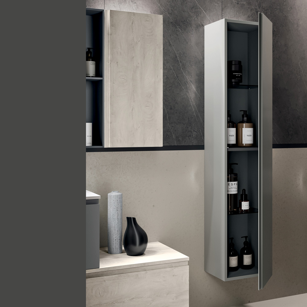 Die hängende Wandeinheit in der Ausführung „Alaska-Eiche“ und das offene Element in Anthrazit bereichern die Konstruktion mit funktionalen und dekorativen Lösungen und eignen sich ideal zur Organisation und individuellen Gestaltung des Badezimmers auf elegante und praktische Weise.