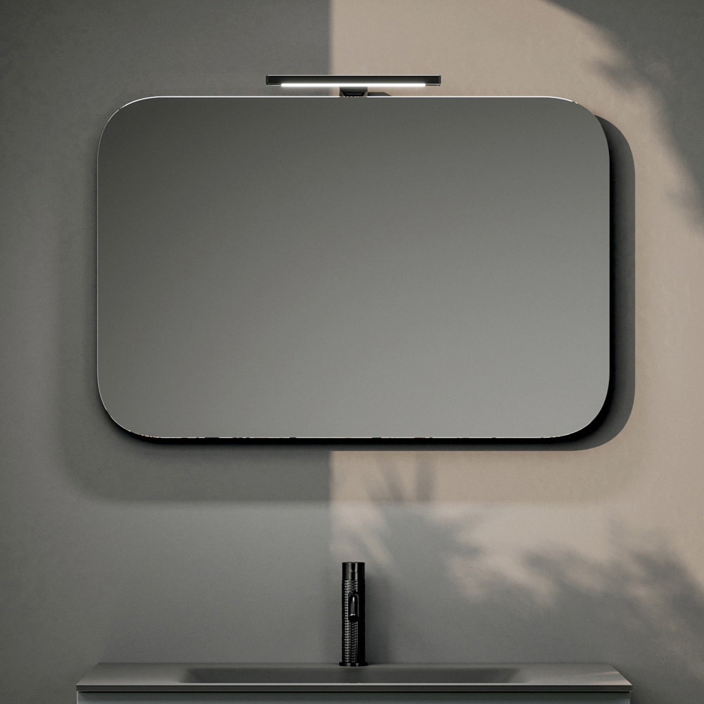 Die schwarze LED-Lampe rundet das Gesamtbild mit einem markanten grafischen Akzent ab und bietet eine funktionale und szenografische Beleuchtung, die sich ideal eignet, um im Waschbeckenbereich eine intime und anspruchsvolle Atmosphäre zu schaffen.