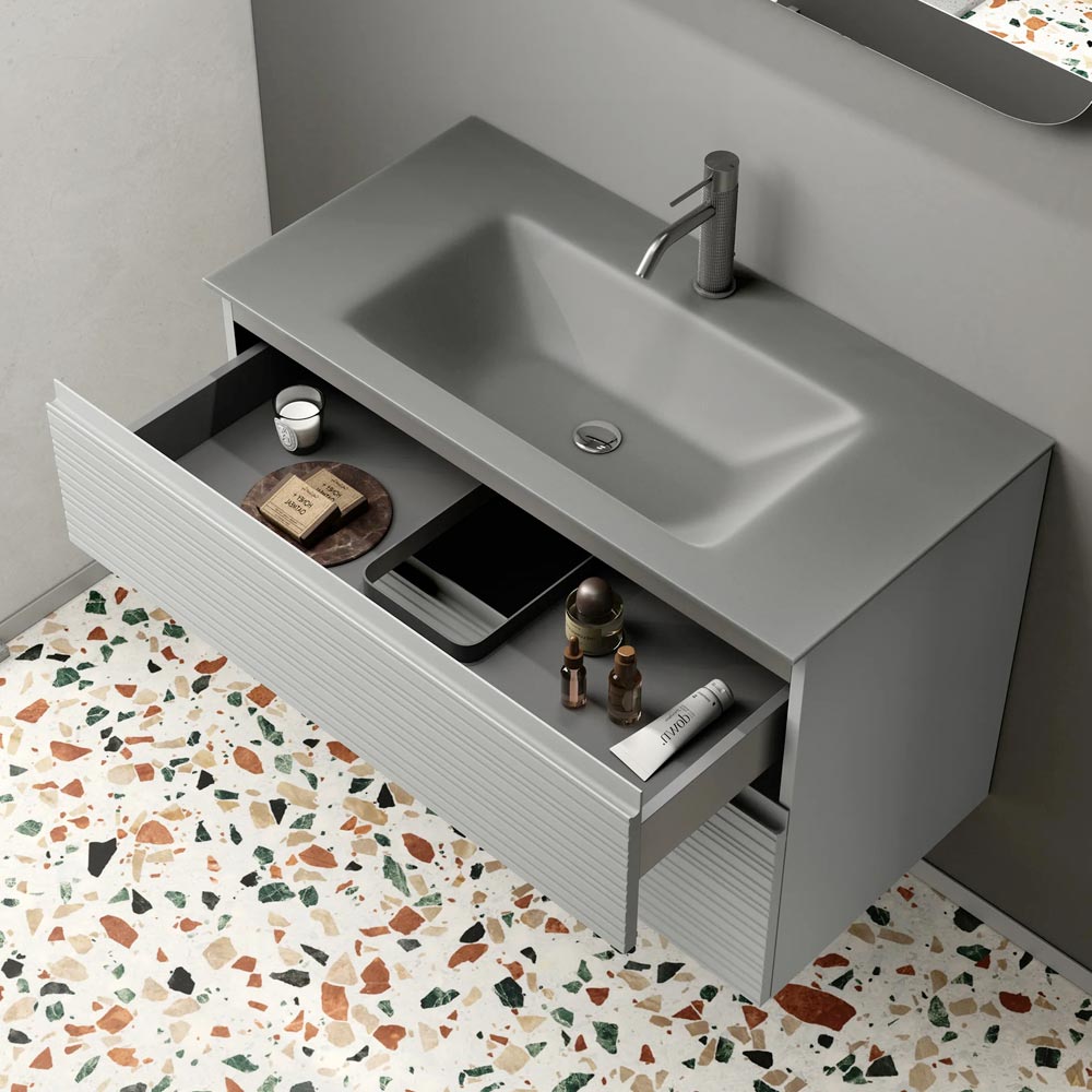 Das graue, satinierte Glaswaschbecken bildet das Herzstück der Komposition: eine optisch beeindruckende Lösung, die Leichtigkeit, Helligkeit und Widerstandsfähigkeit vereint und alltägliche Gesten in ein Designerlebnis verwandelt.