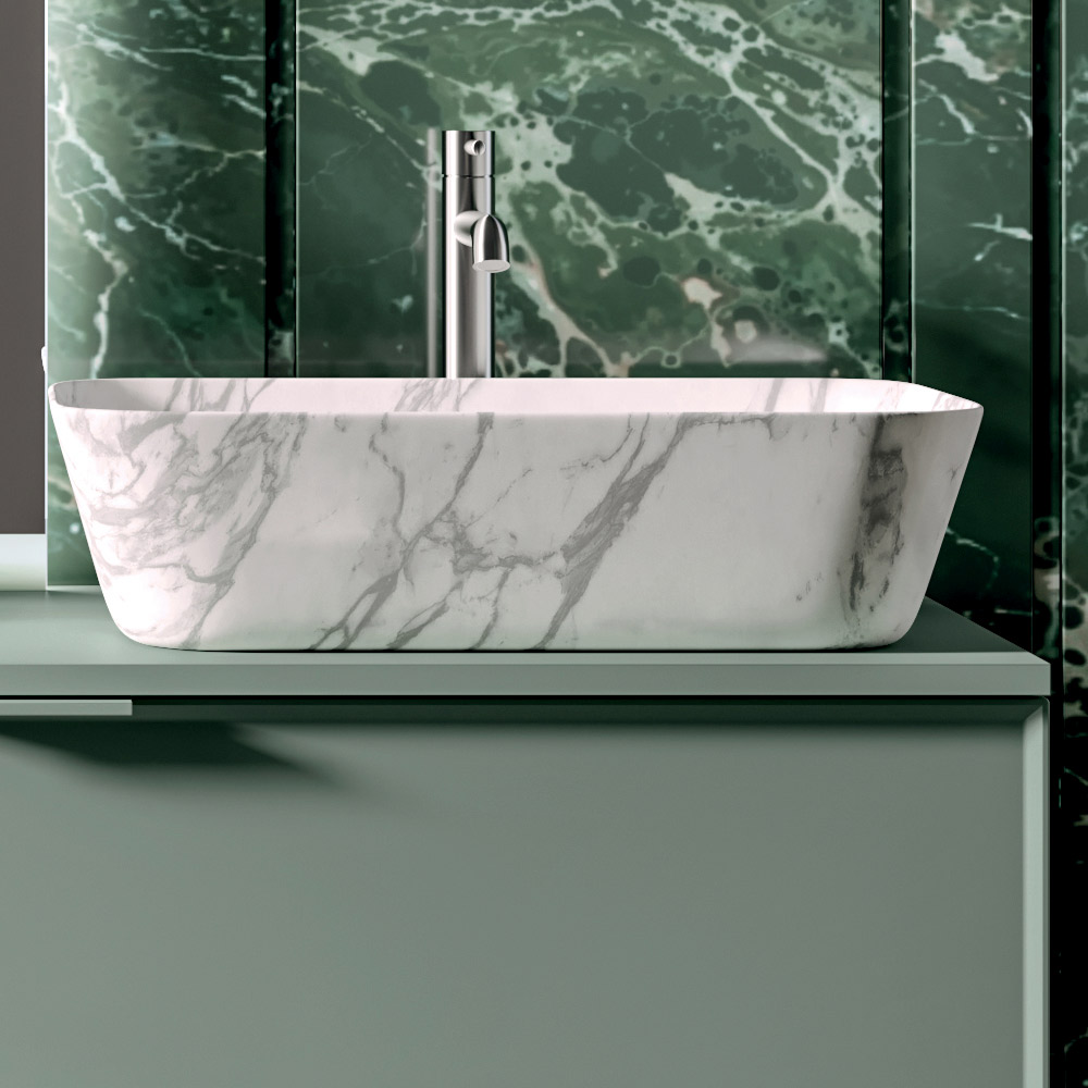Das Aufsatzwaschbecken aus Keramik in Calacatta-Optik bringt ein äußerst wertvolles Materialelement ein: Seine feine Maserung erinnert an natürlichen Marmor und wertet die gesamte Badezimmerausstattung auf.