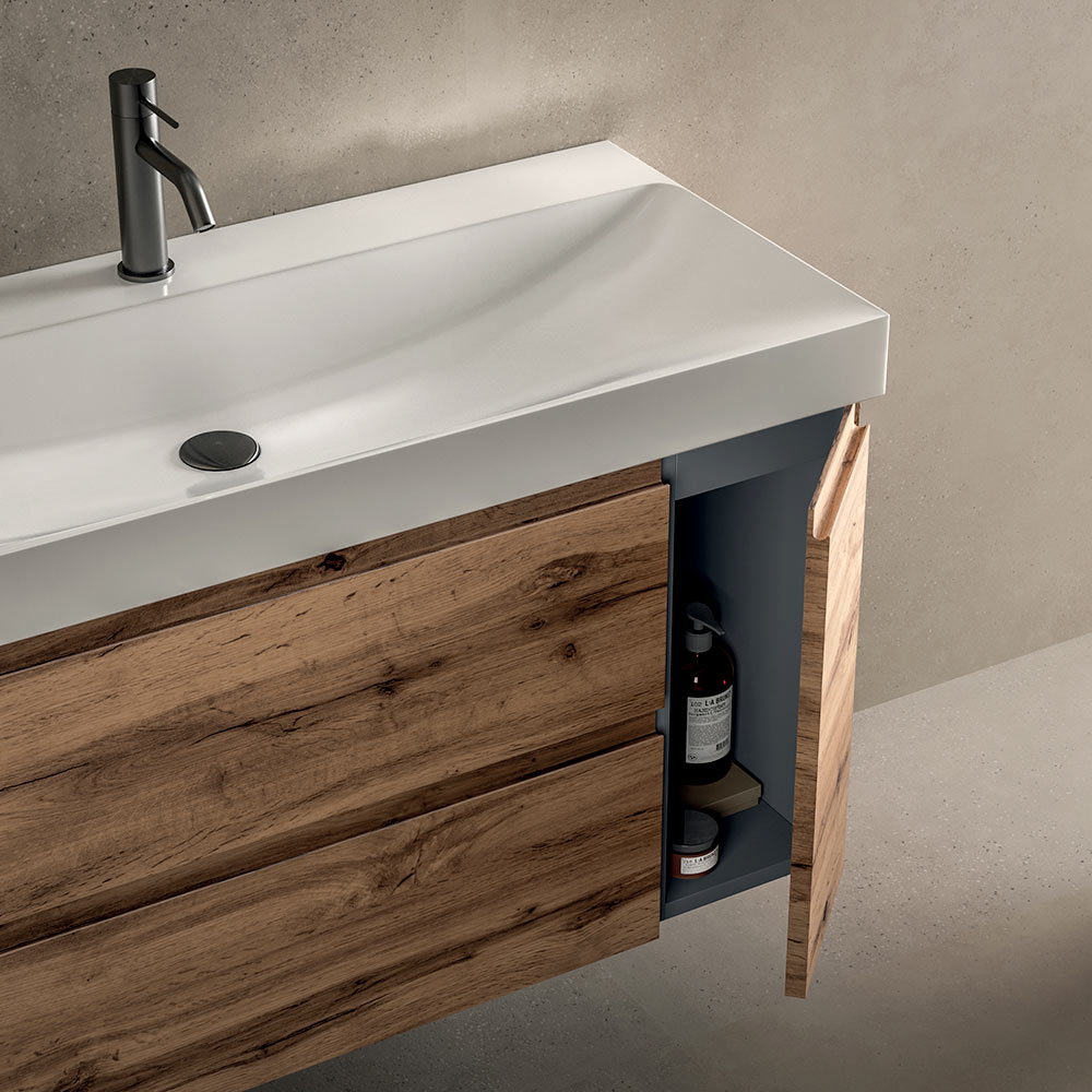 Der Unterschrank mit zwei Schubladen und einer Seitentür bietet praktischen Stauraum und vereint Alltagstauglichkeit mit einer klaren Ästhetik. Die geradlinige und schwebende Konstruktion lässt das Badezimmer optisch leichter wirken.