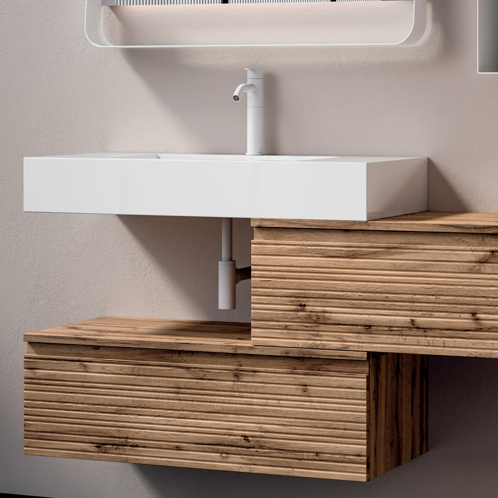 Die glänzend weiße Waschtischplatte hellt den Raum auf und bildet einen raffinierten Kontrast zum Holz. Sie bietet eine strapazierfähige, leicht zu reinigende Oberfläche, die für den täglichen Gebrauch konzipiert ist.