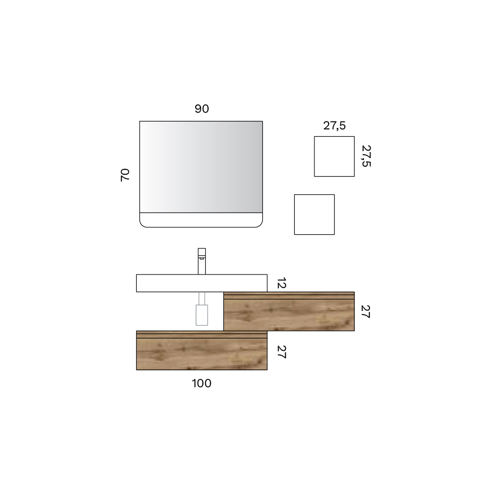 • Waschbecken: Länge 100 cm x Tiefe 45 cm x Höhe 12 cm
