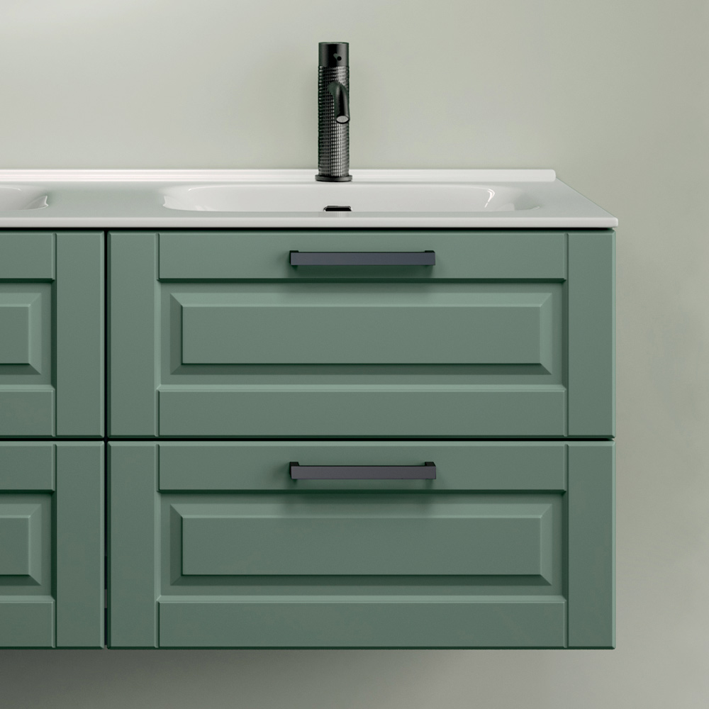 Eine Badezimmergestaltung mit raffiniertem und modernem Charakter, die sich durch die elegante , matte Salbeigrün-Oberfläche auszeichnet – ein anspruchsvoller Farbton, der dem Raum Persönlichkeit und Harmonie verleiht.