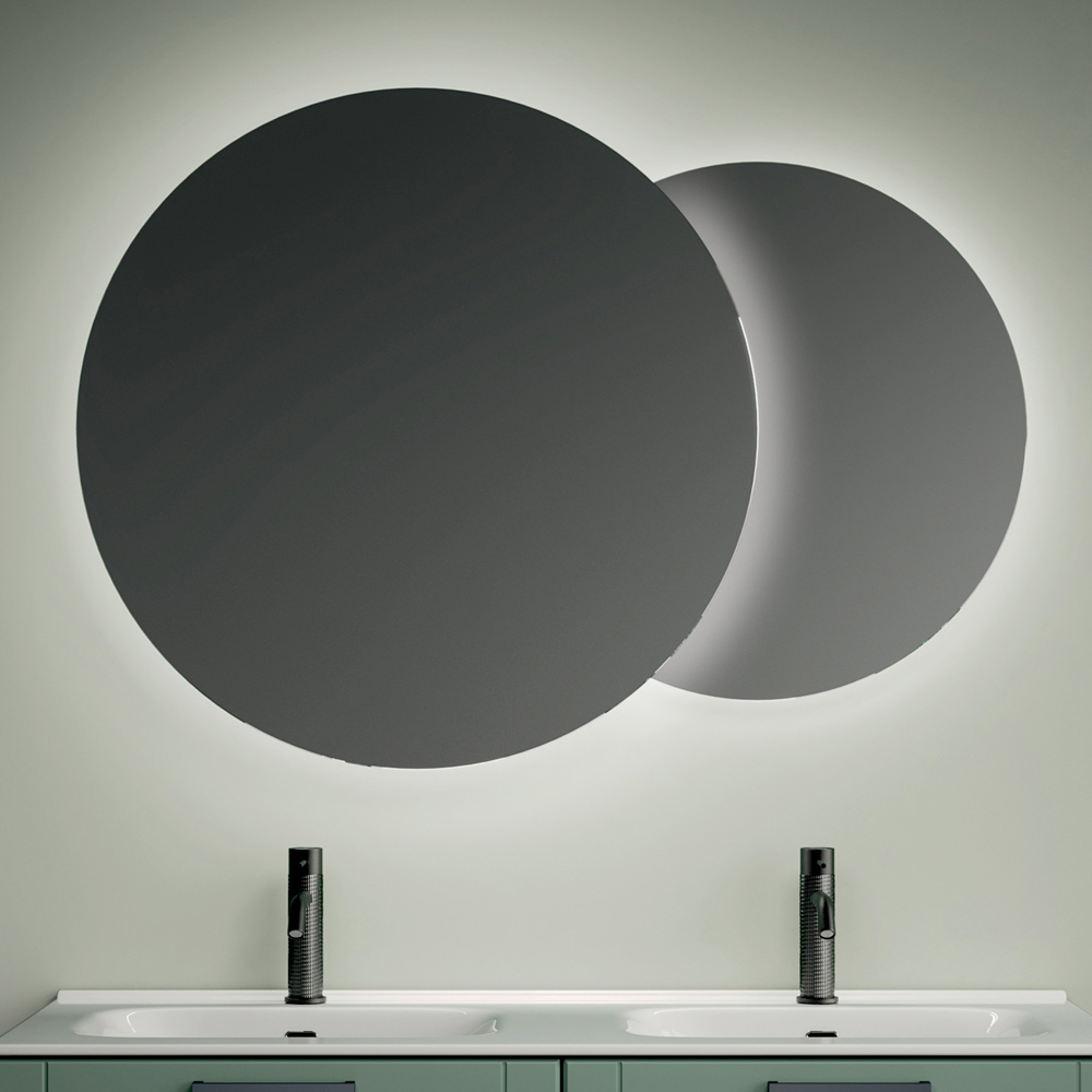 Die hinterleuchteten runden Spiegel runden die Komposition mit einem stimmungsvollen Lichteffekt ab, verstärken die Raumwahrnehmung und schaffen eine einhüllende und moderne Atmosphäre.