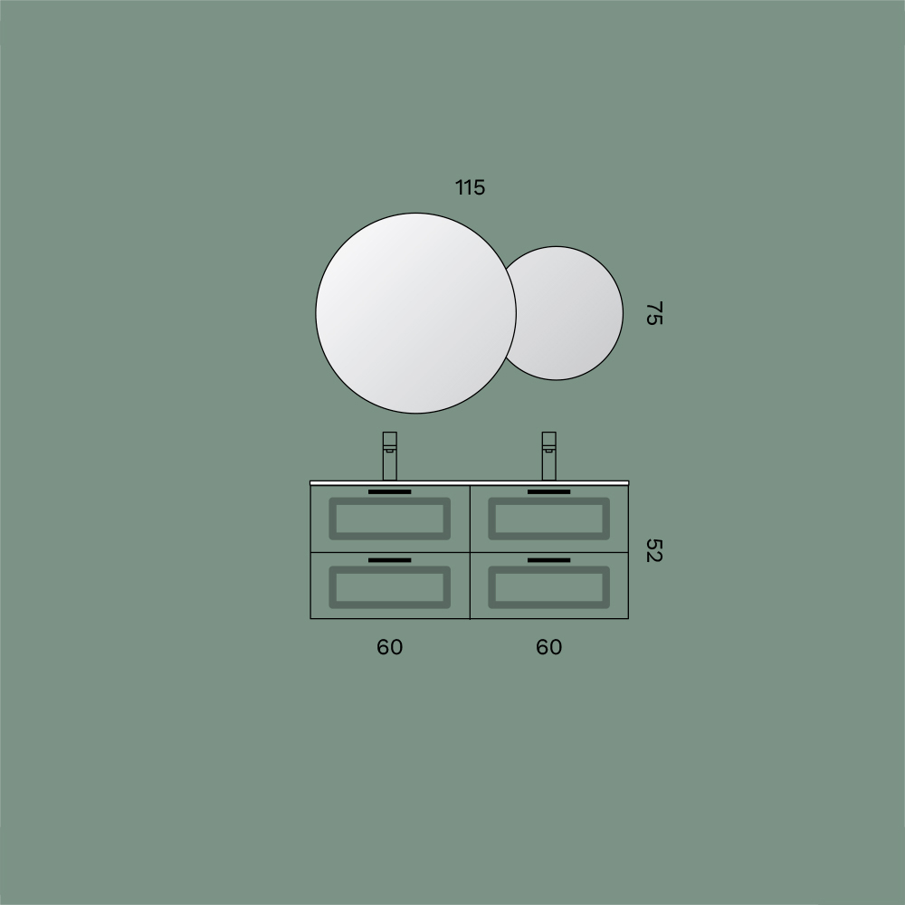 Die beiden wandhängenden Unterschränke mit je zwei Schubladen schaffen eine harmonische und funktionale Atmosphäre und unterstreichen den Raum mit klaren Linien und modernen Proportionen. Die Doppelwaschbecken aus weißer Keramik bieten maximalen Komfort im Alltag und sorgen gleichzeitig für ein aufgeräumtes und modernes Erscheinungsbild.