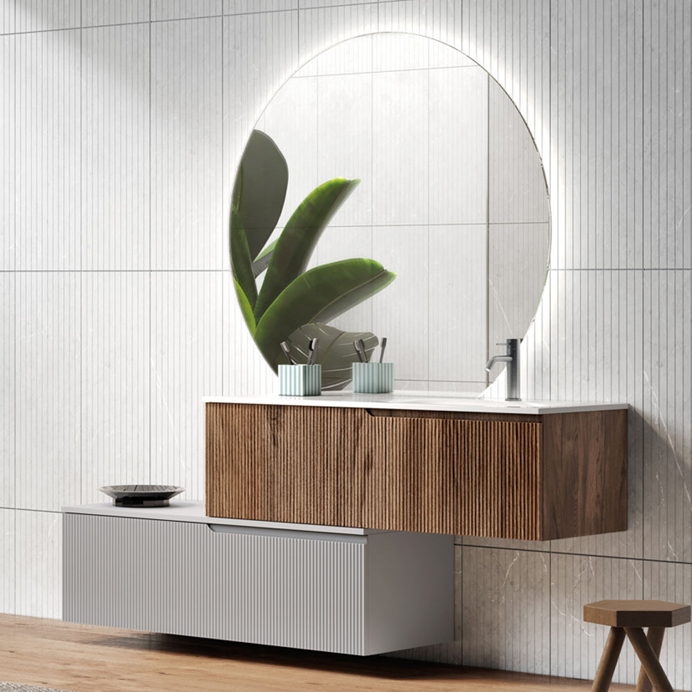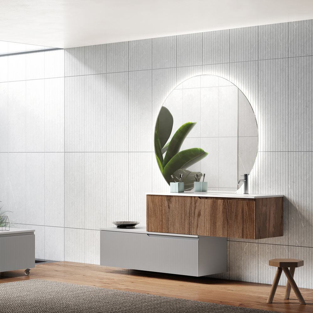 Badezimmerkomposition aus grauem MDF und gerippter Rio-Eiche. Made in Italy