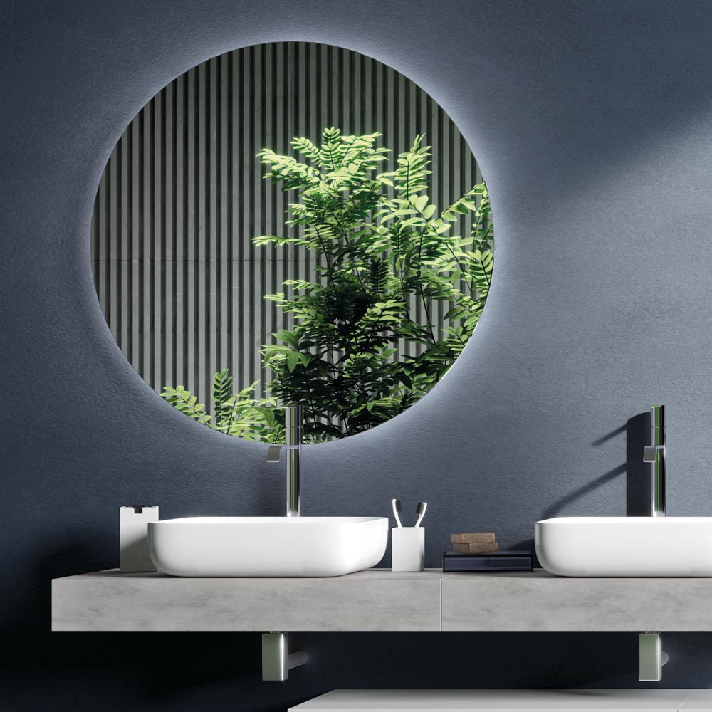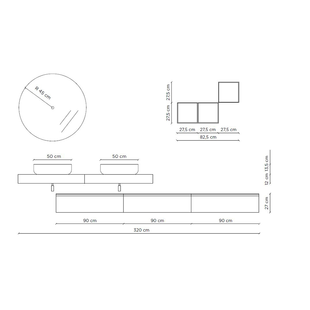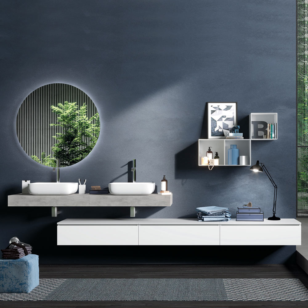 Badezimmerkomposition bestehend aus: 2 Waschbecken aus glänzend weißer Keramik, die auf zwei Platten aus beschichtetem MDF und zementfarbenem HPL ruhen, einem Sockel aus glänzend weißem, kratzfestem Melamin und einem runden Spiegel mit umlaufender LED.