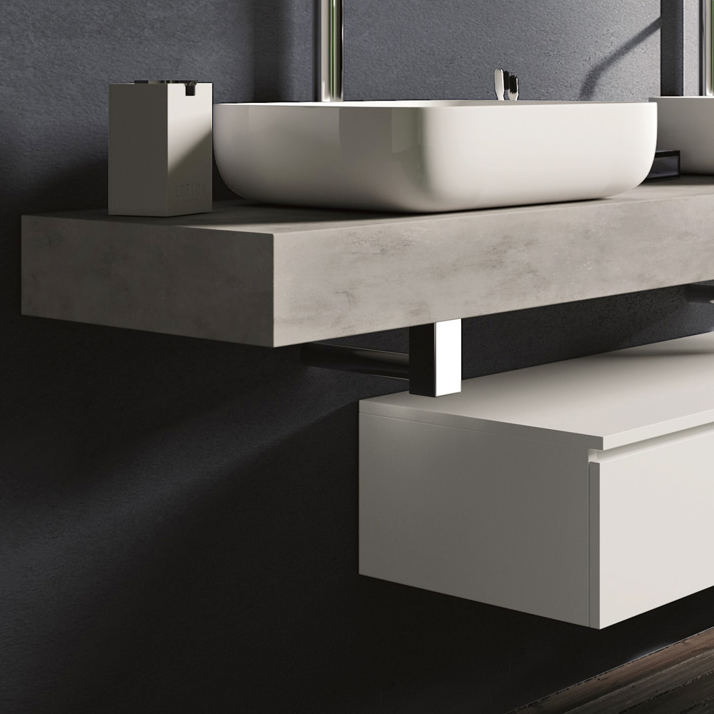 Badezimmerkomposition in Betonfarbe und Mattweiß mit Waschbecken, Spiegel und Sockel – Palom