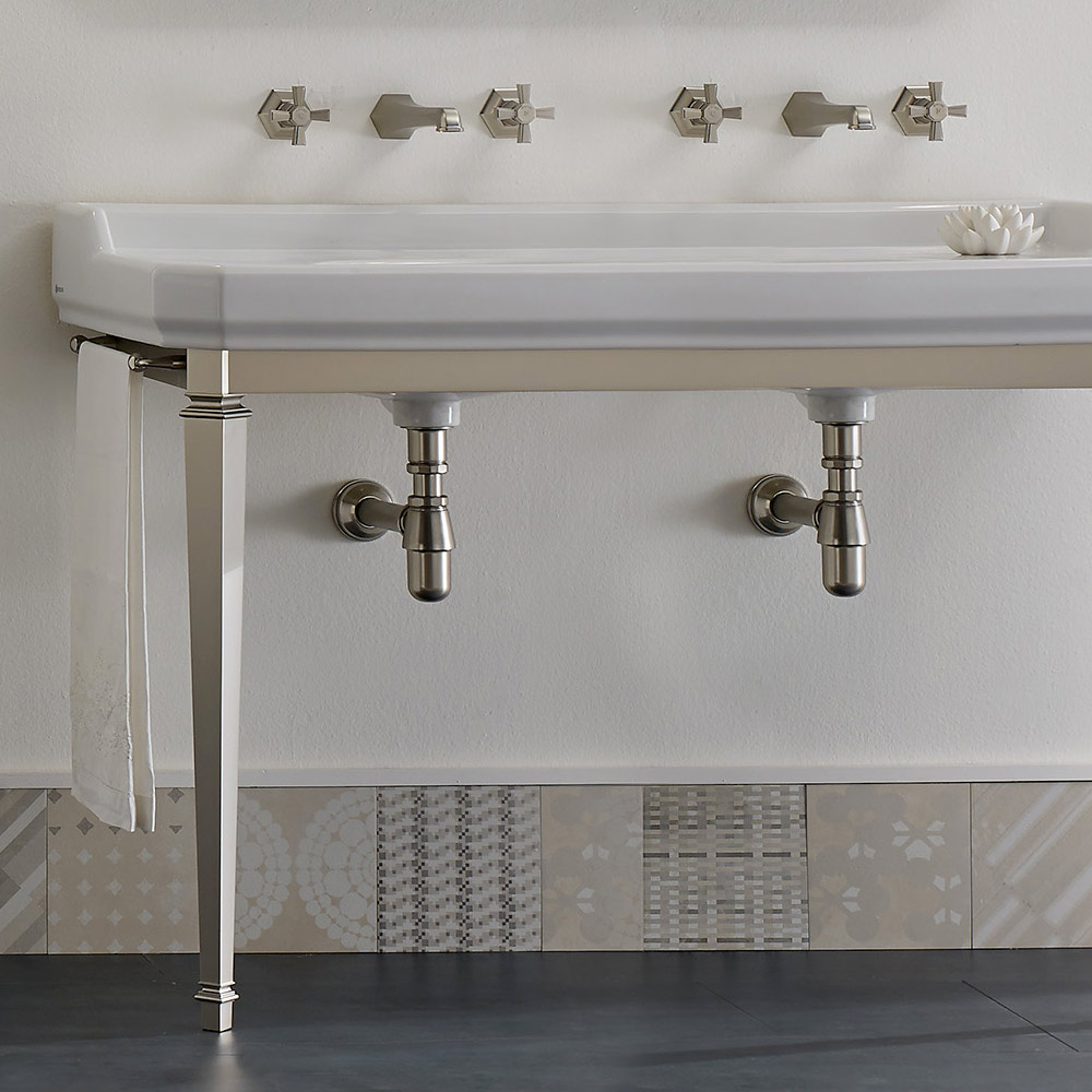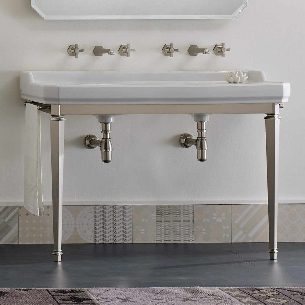Dieser Artikel besteht aus einem Doppelwaschbecken mit Aufkantung und 1 oder 3 Hahnlöchern pro Becken (geben Sie die Anzahl der zum Zeitpunkt der Bestellung erforderlichen Hahnlöcher an) mit einer Länge von 1350 mm, das von einer Struktur aus Metallfüßen in Nickeloberfläche getragen wird .