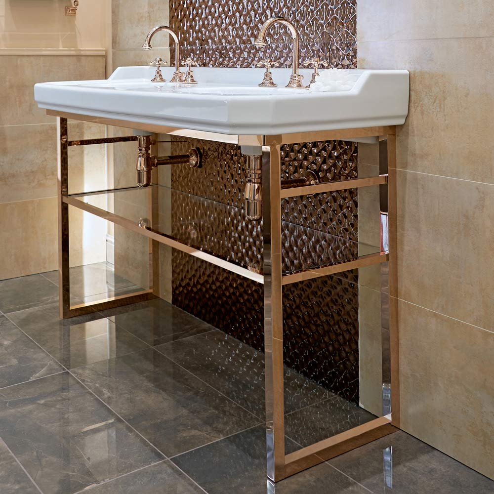 1 oder 3 Hahnlöchern pro Becken (bei Bestellung die erforderliche Anzahl von Löchern angeben), 1350 mm lang, getragen von einer Struktur aus Metallfüßen im Finish Rotgold.