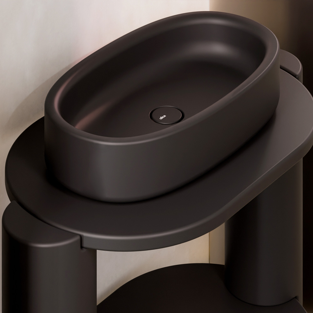 Ein Einrichtungsaccessoire, das moderne Linien und weiche Geometrien kombiniert und für alle gedacht ist, die ein elegantes, praktisches und außergewöhnliches Badezimmer suchen.