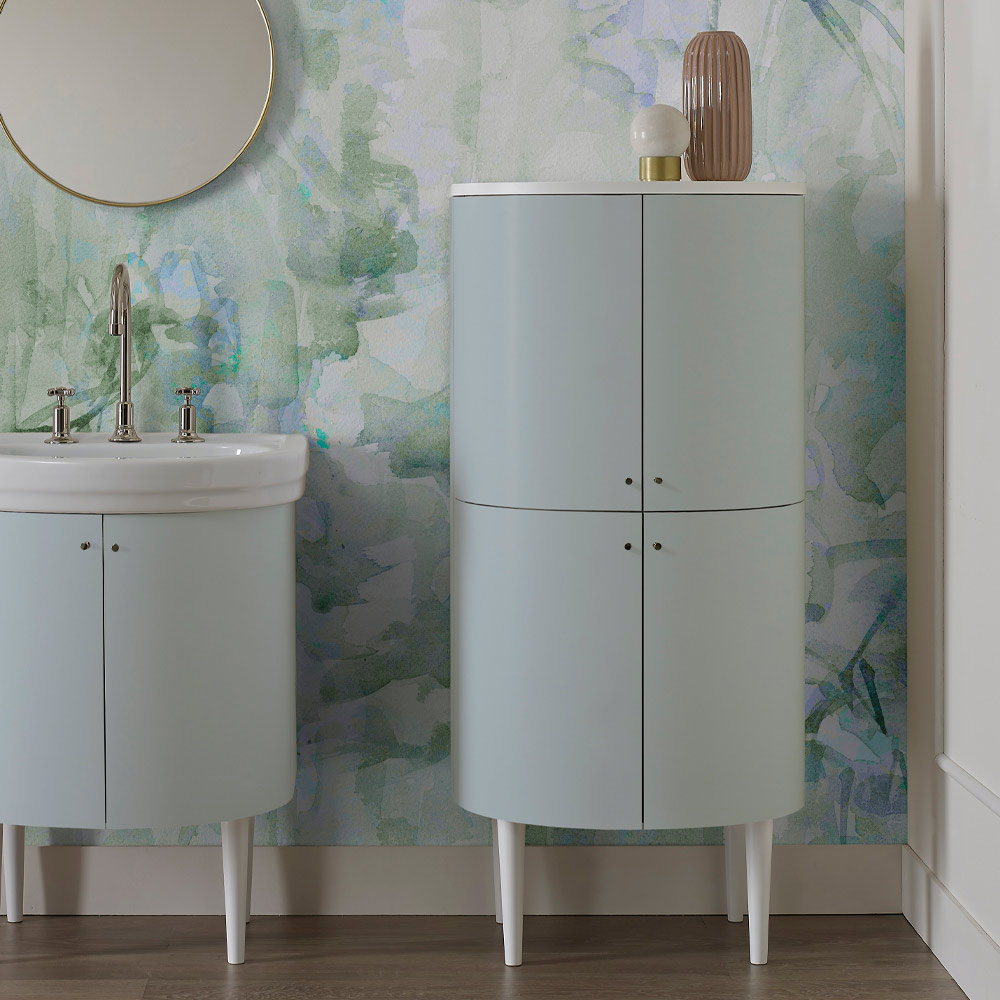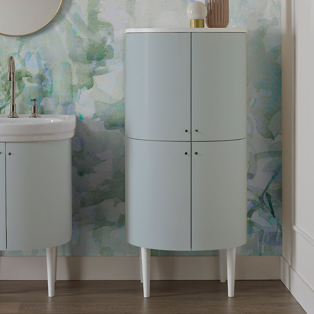 MDF-Säule mit vier Türen hellblaues, mattes Finish die drei Regale verschließen, davon zwei aus Glas und eines aus Hydro-MDF. Das obere Regal und die Beine sind in mattweißem Finish gehalten und die Knöpfe sind in Nickel- Finish enthalten.