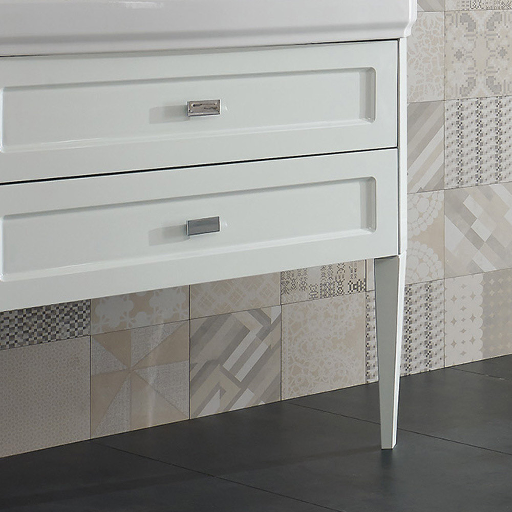 MDF-Badezimmerschrank mit zwei Schubladen und weißem Keramikwaschbecken inklusive. Rechteckige Griffe aus Nickel sind im Preis inbegriffen. Die Außenseite des Schrankes ist glänzend lackiert, die Innenseite ist matt lackiert.