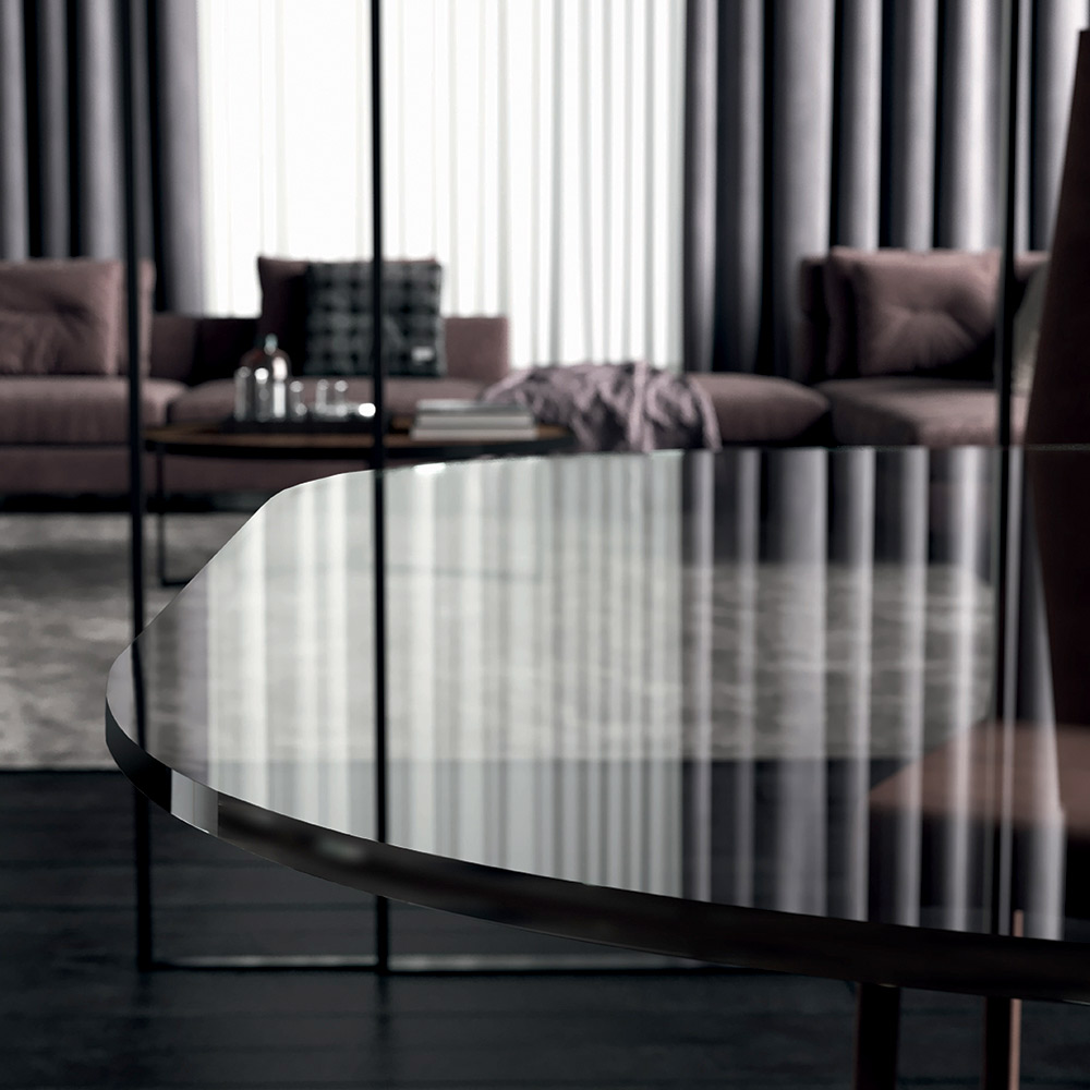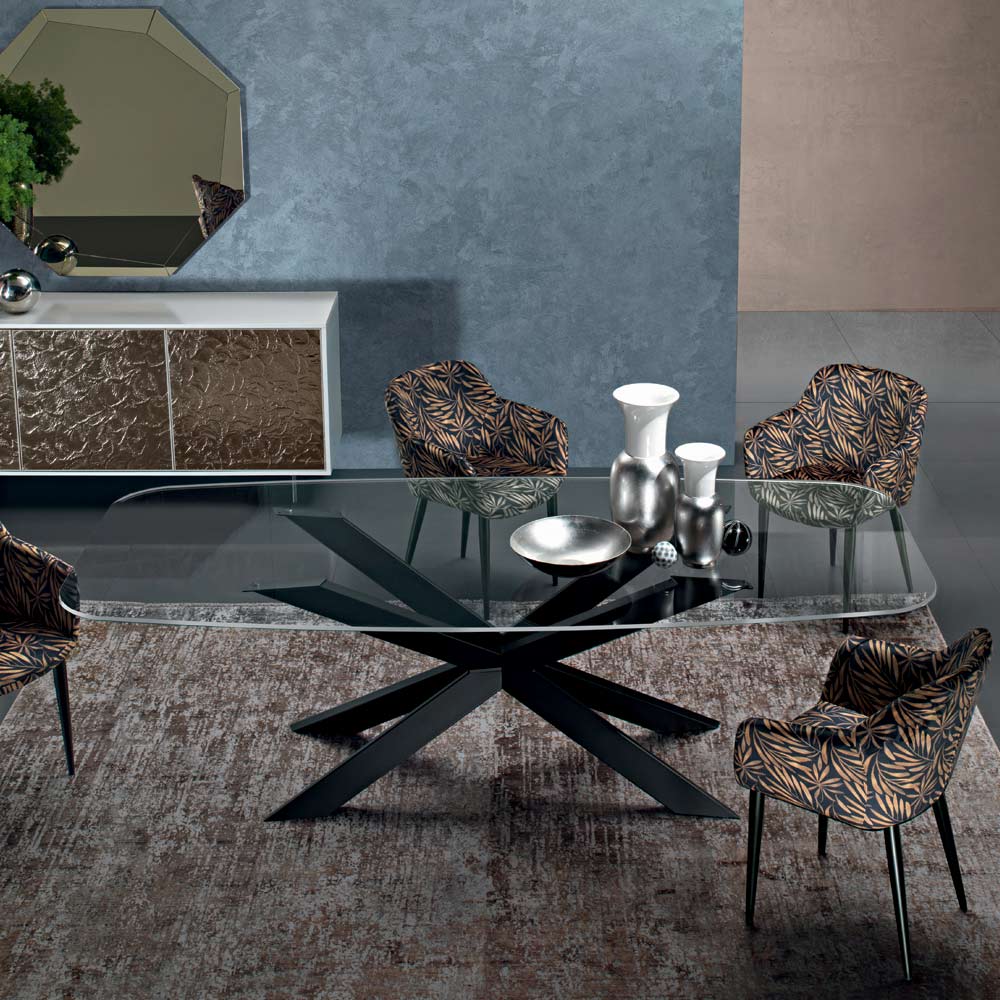 exklusive Note verleiht. Die herrliche Kombination aus der zeitlosen Eleganz von Glas und der originellen Form der Fassplatte erweckt einen Esstisch mit einer raffinierten Seele zum Leben, der den umgebenden Stil mit einer einzigartigen und modernen Note vervollständigt. So entsteht eine Einrichtungslösung mit