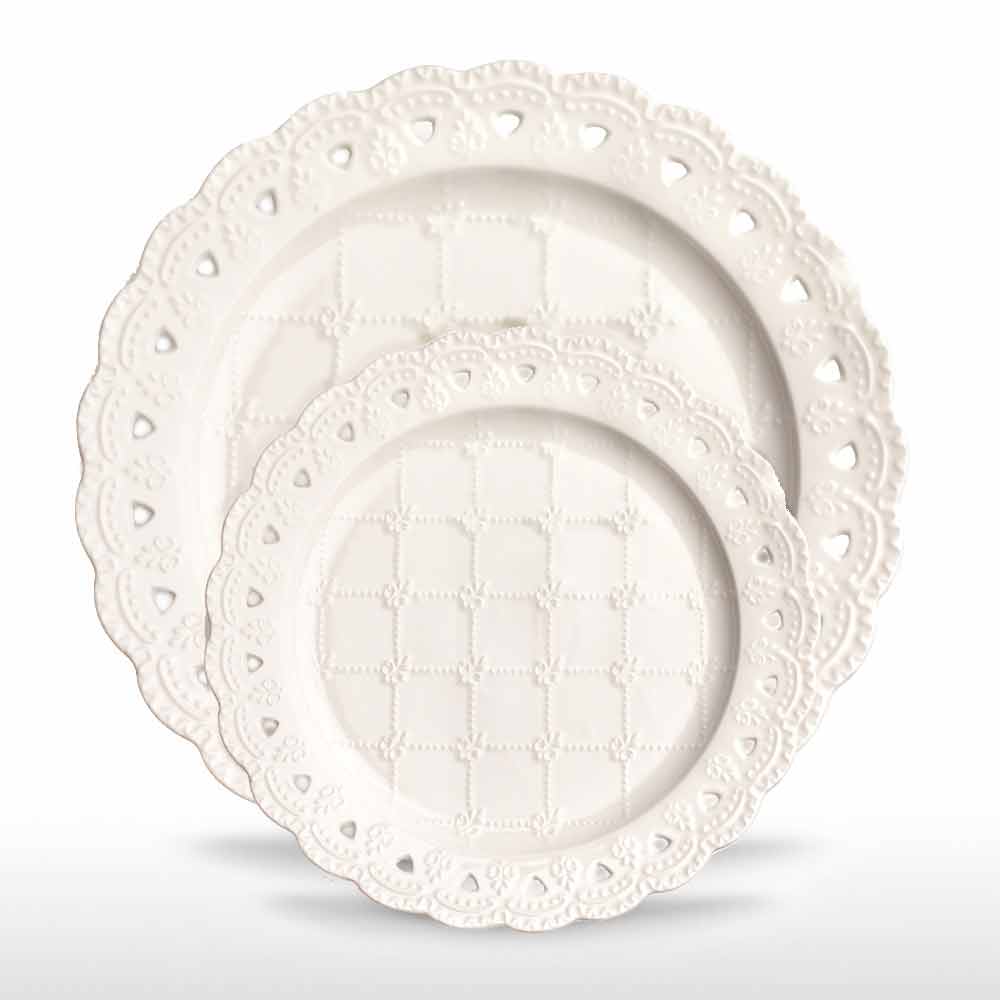 12 Bevorzugung von Tellern aus weißem Porzellan mit wertvollen Reliefdekorationen und handgestochenen Motiven in zwei Größen.