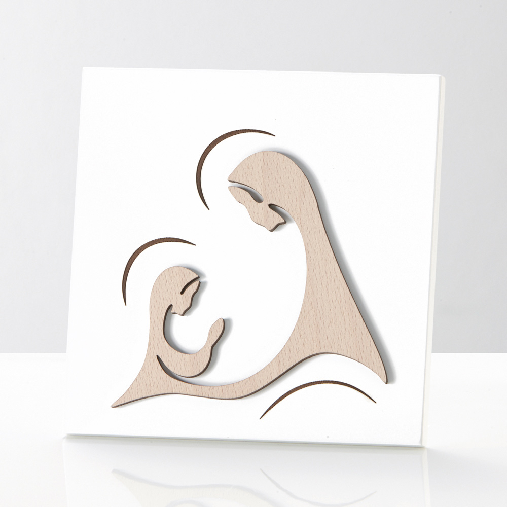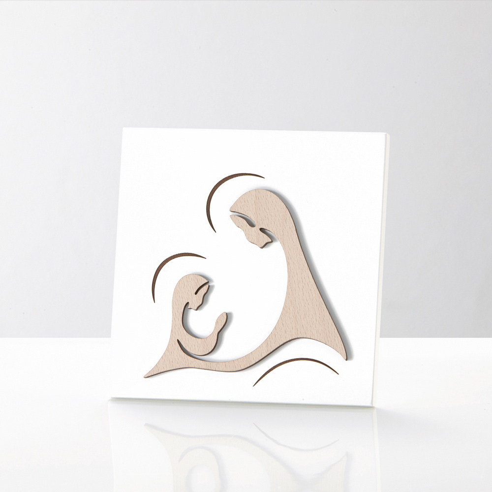 Heiliges Bild mit der Darstellung der Erscheinung der Madonna aus Naturholz und Lasergravur. Weiß lackierte Holzplatte mit Stützfuß und Loch zum Aufhängen an der Wand.