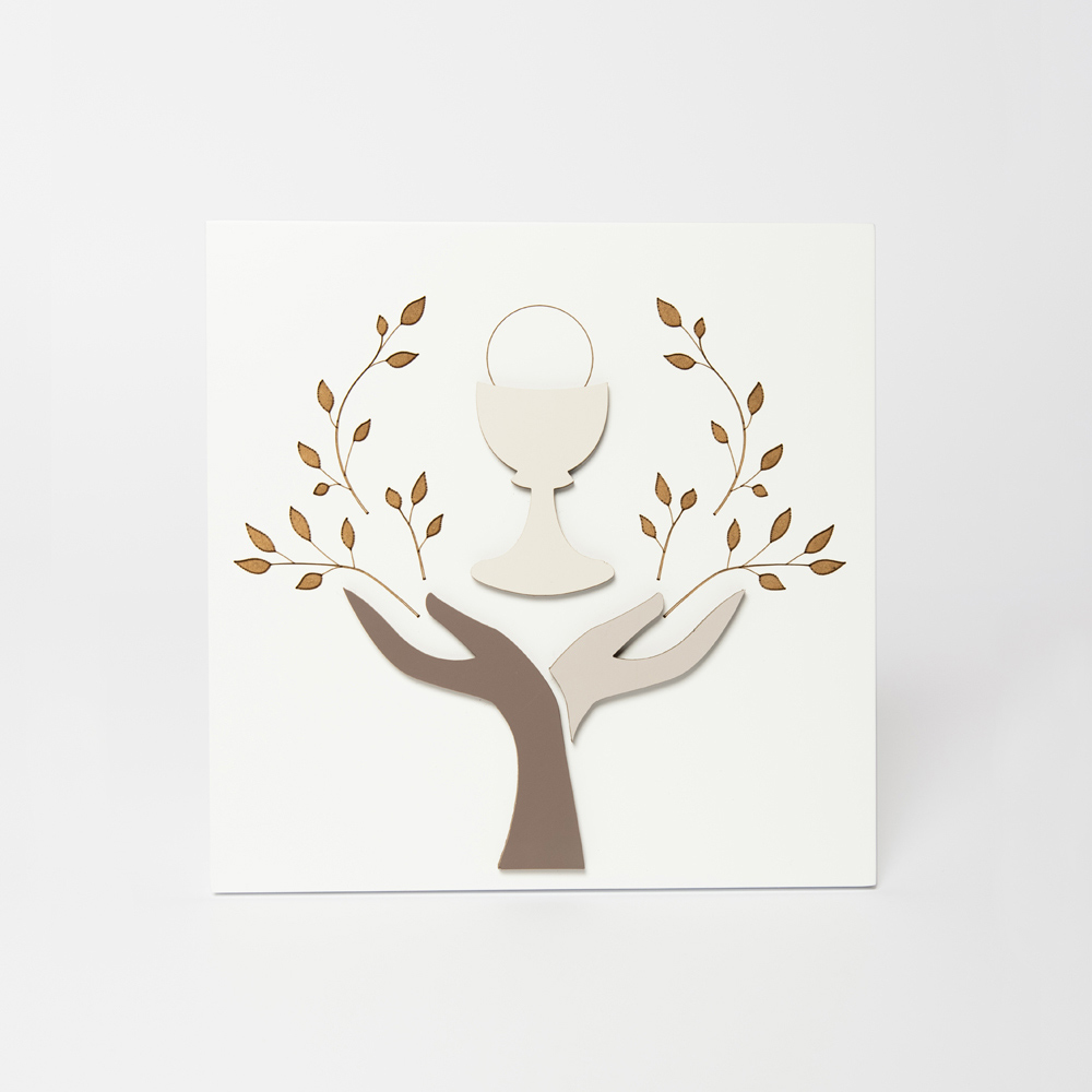 Heiliges Bild mit aufgesetzten Dekorationen aus kakaolackiertem Holz, Kies und Sand und Lasermarkierung von Zweigen und Blättern. Es stellt zwei Hände dar, die den Kelch der Kommunion begrüßen. Das Gemälde besteht aus weiß lackiertem Holz und verfügt über ein Loch zum Aufhängen an der Wand und einen Standfuß.