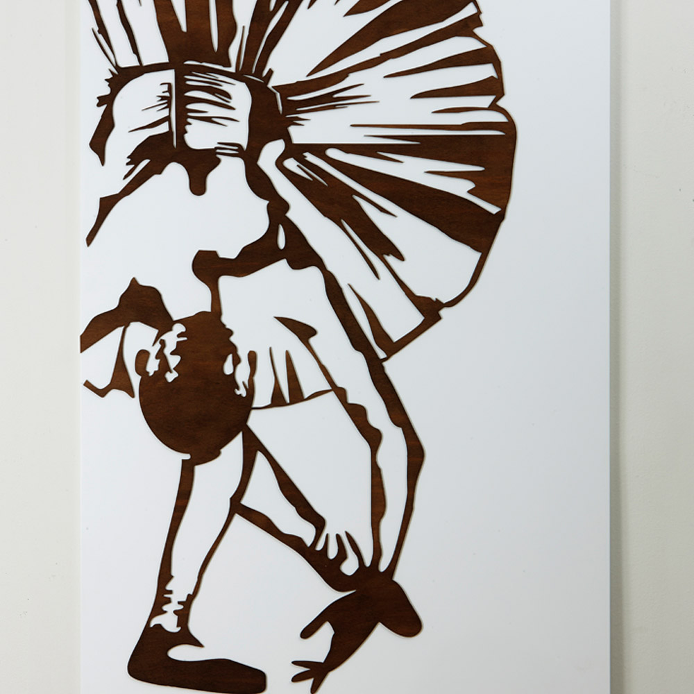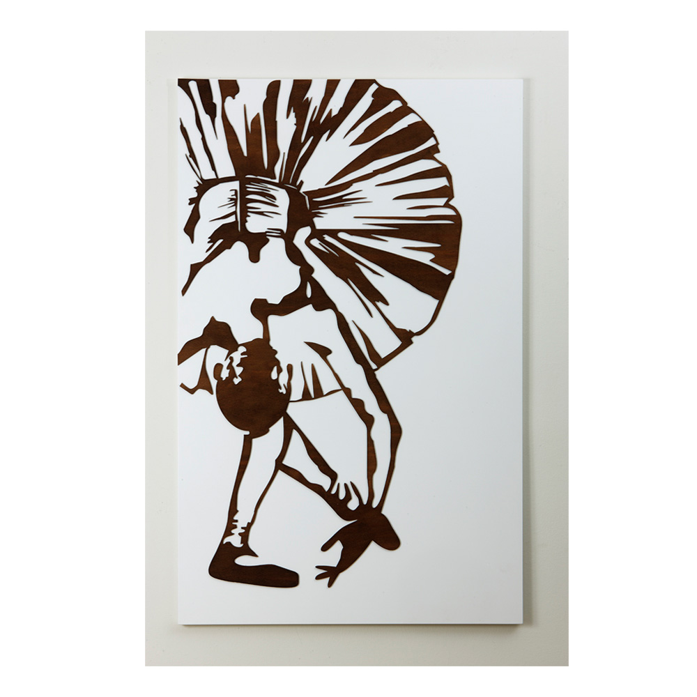 Die dekorative Platte wird mithilfe der Lasermarkierungstechnik hergestellt, die ein Flachrelief auf dem Material erzeugt und so unterschiedliche Farbabstufungen auf der Platte erzeugt. Das Gestell besteht aus weiß lackiertem Holz mit wengefarbenen Applikationen.