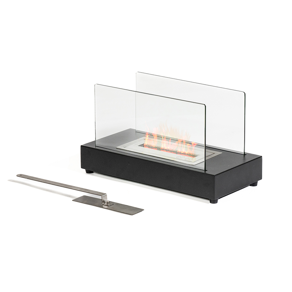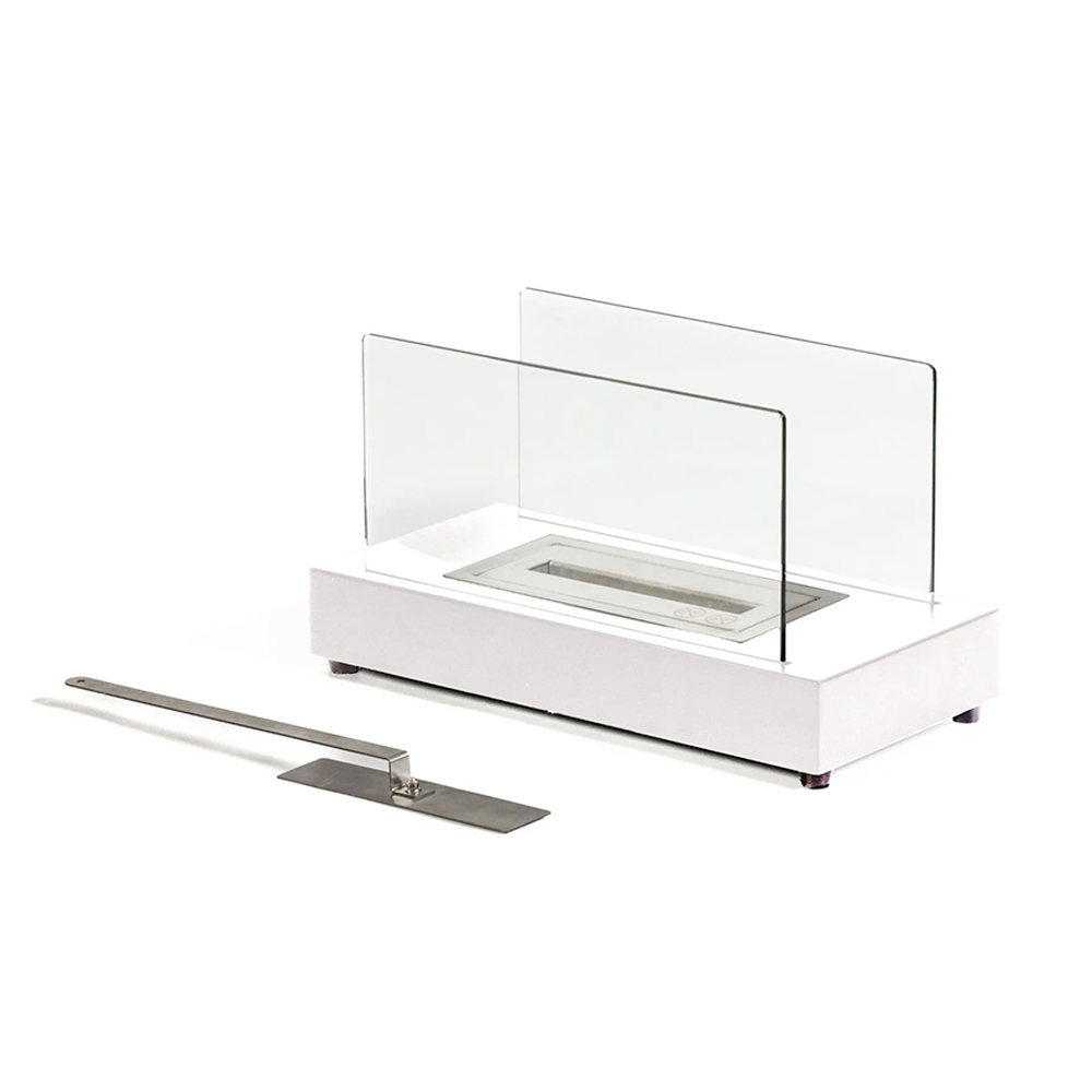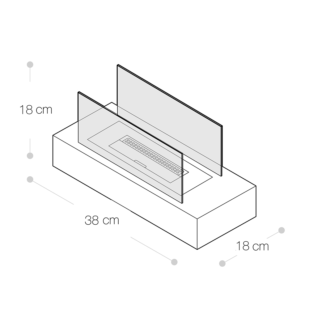 Die Struktur besteht aus Metall und das gehärtete Glas schützt die Flamme vor möglichen Windböen und hebt sie hervor; Dadurch ist es auch für den Außenbereich geeignet.