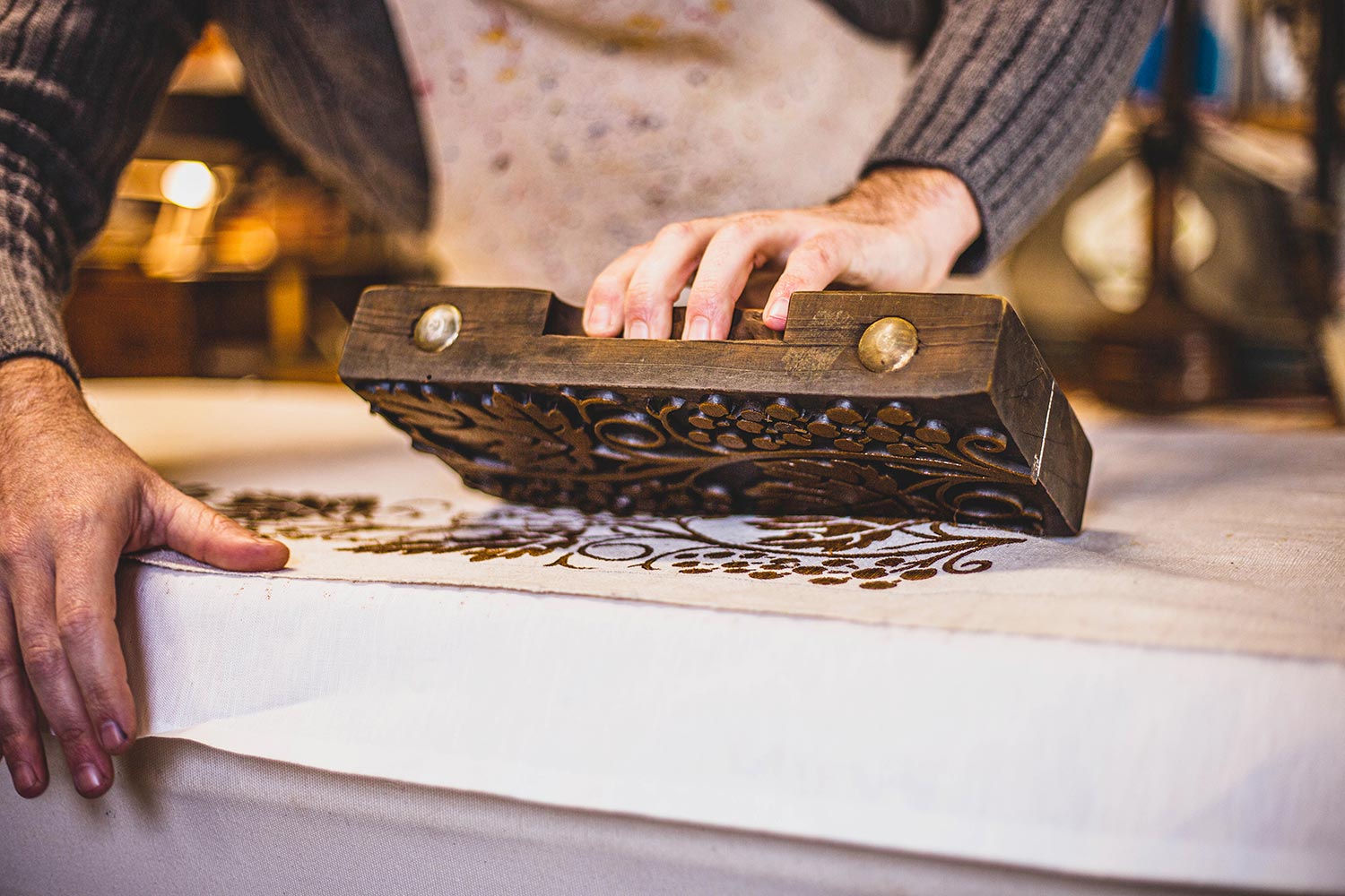 Tatsächlich sind die im Geschäft verwendeten Farben natürlich und mineralisch. Sie werden fachmännisch nach einem geheimen Familienrezept dosiert. Bei der Auswahl der Farben in den Romagna-Drucken überwiegt die Rostfarbe, ein unauslöschliches Ockergelb im Laufe der Zeit, intensives Blau , Grün und Rot.