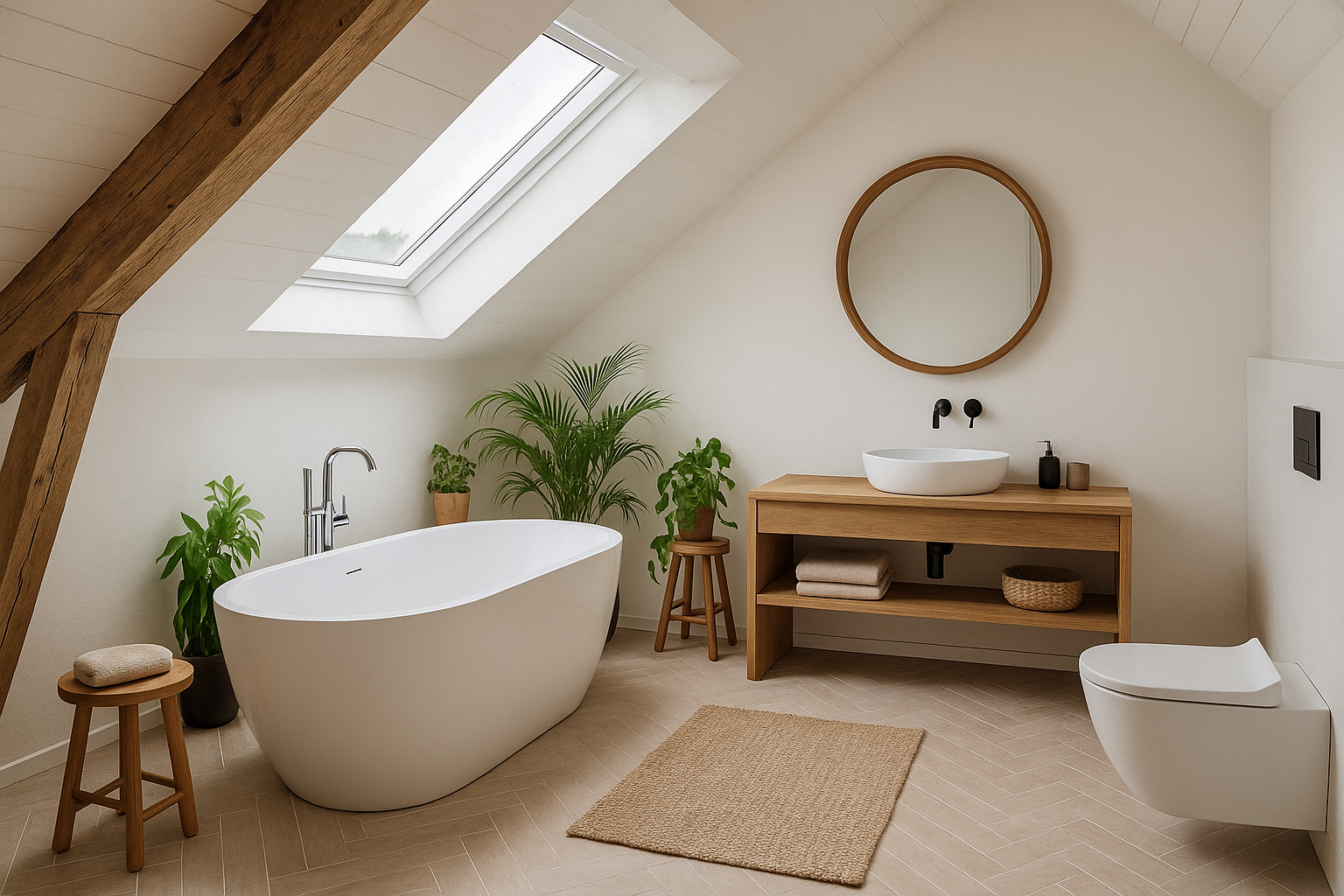 Auf einem Dachboden ist Licht alles . Wenn Sie ein Dachfenster haben, nutzen Sie es optimal. Aber der wahre Hauch von Stil? Ein mehrschichtiges Beleuchtungssystem. Denken Sie an Wandlampen mit Rahmen aus gebürstetem Messing , handgefertigt in Italien, die warme und einladende Reflexe erzeugen. Ja, sogar im Badezimmer.