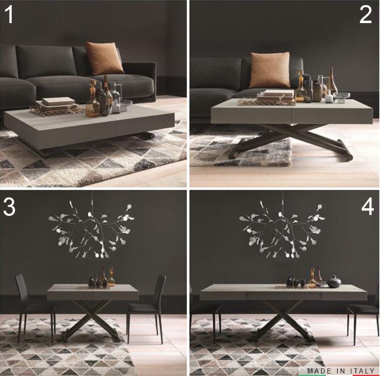 Aus diesem Grund schlagen wir das neue und unverzichtbare Konzept von Design und Platzersparnis vor: die verwandelnden Couchtische, die zu Esstischen werden. Sie sind für den Einsatz in jeder Situation und vor allem äußerst einfach konzipiert. Diese Tische können nur mit leichtem Handdruck angehoben und in jeder Höhe verriegelt werden, wodurch auch Aperitif-Tische entstehenund nicht nur die klassischen Esstische.