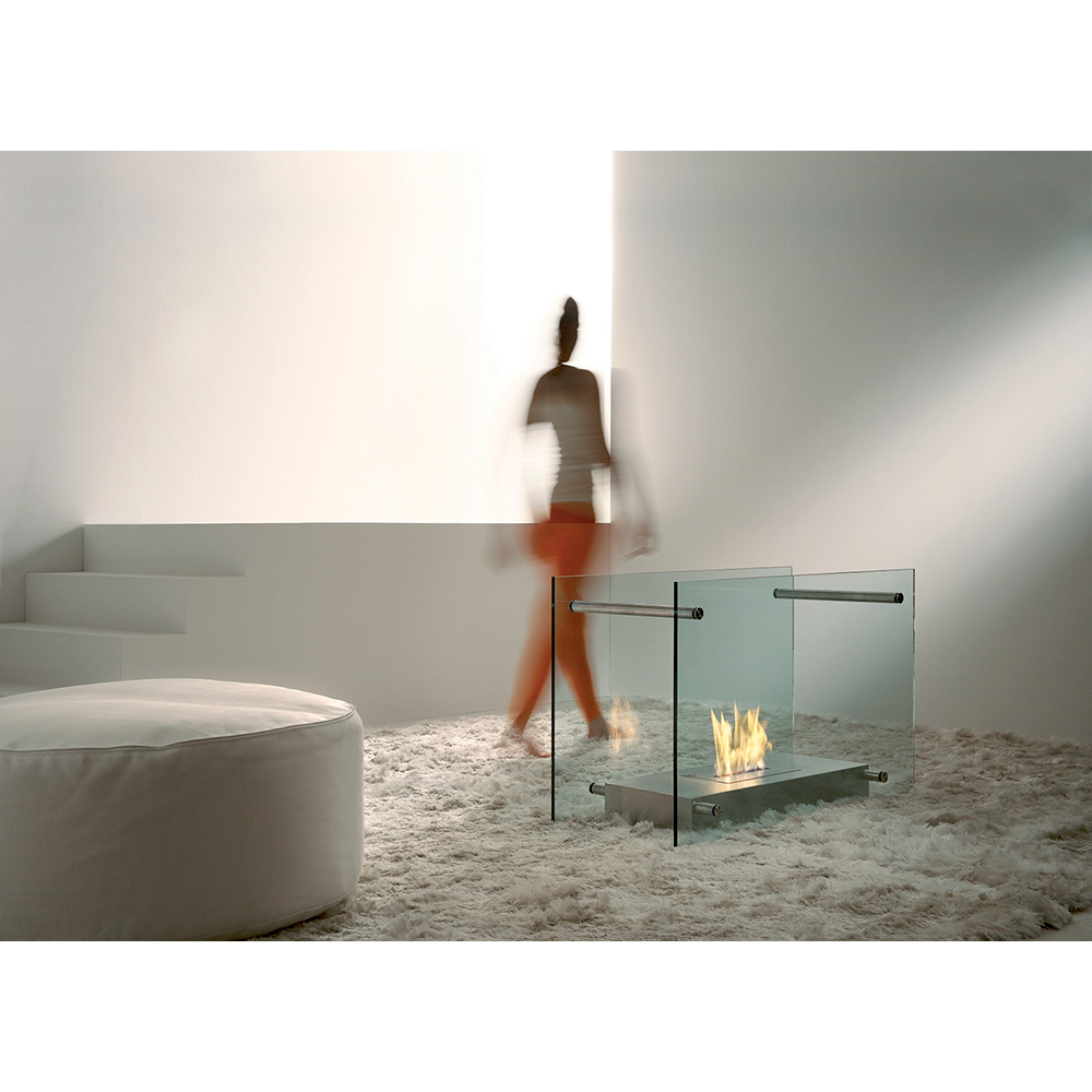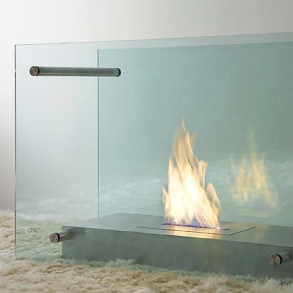 Dieser elegante und verführerische Bio-Innenkamin ist ein faszinierendes Spiel aus Volumen und Transparenzen, das dank der ästhetischen Leichtigkeit des Glases in der