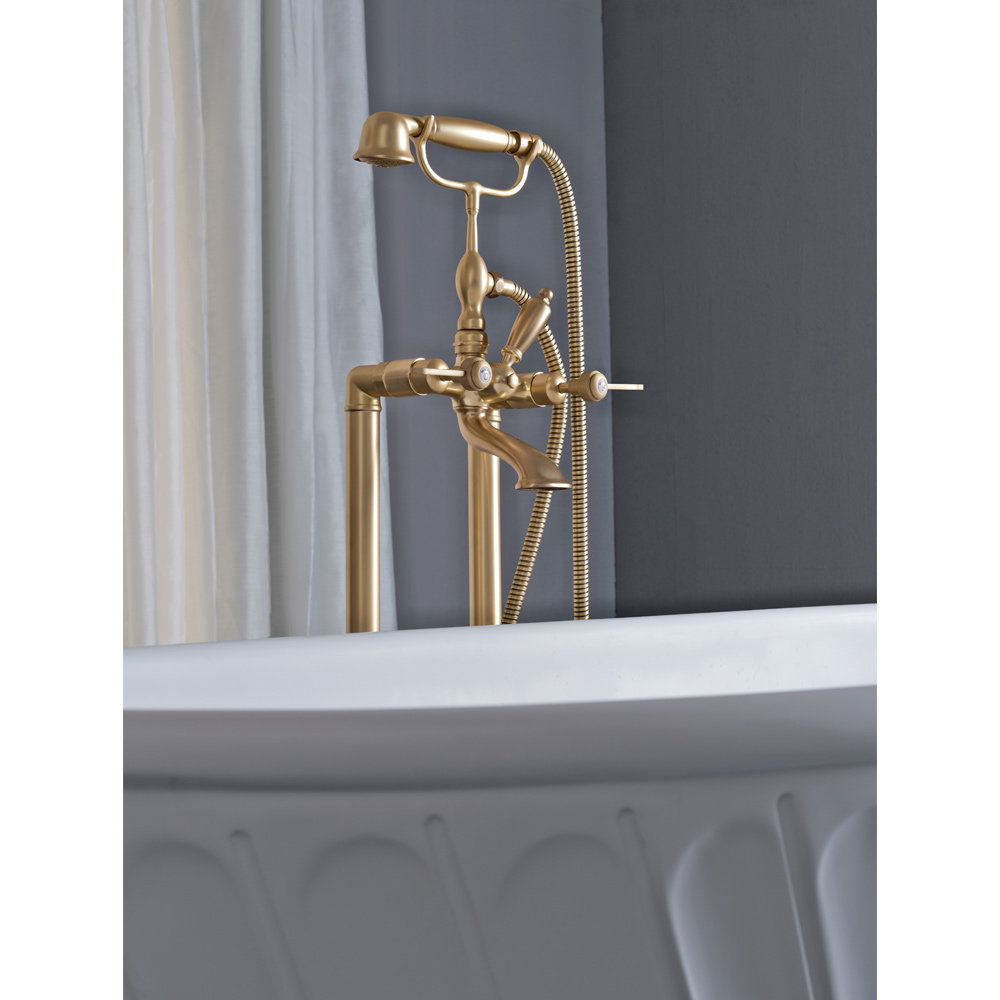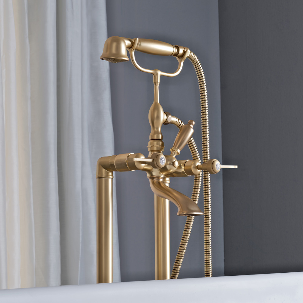 Fußbodenmontierte Badewanne mit Handbrause und flexibel, aus schwerem Messing, gegossen in Formen, die die handwerklichen Systeme der Vergangenheit respektieren und geschützt mit einer dicken Finish-Schicht mattes Messing.