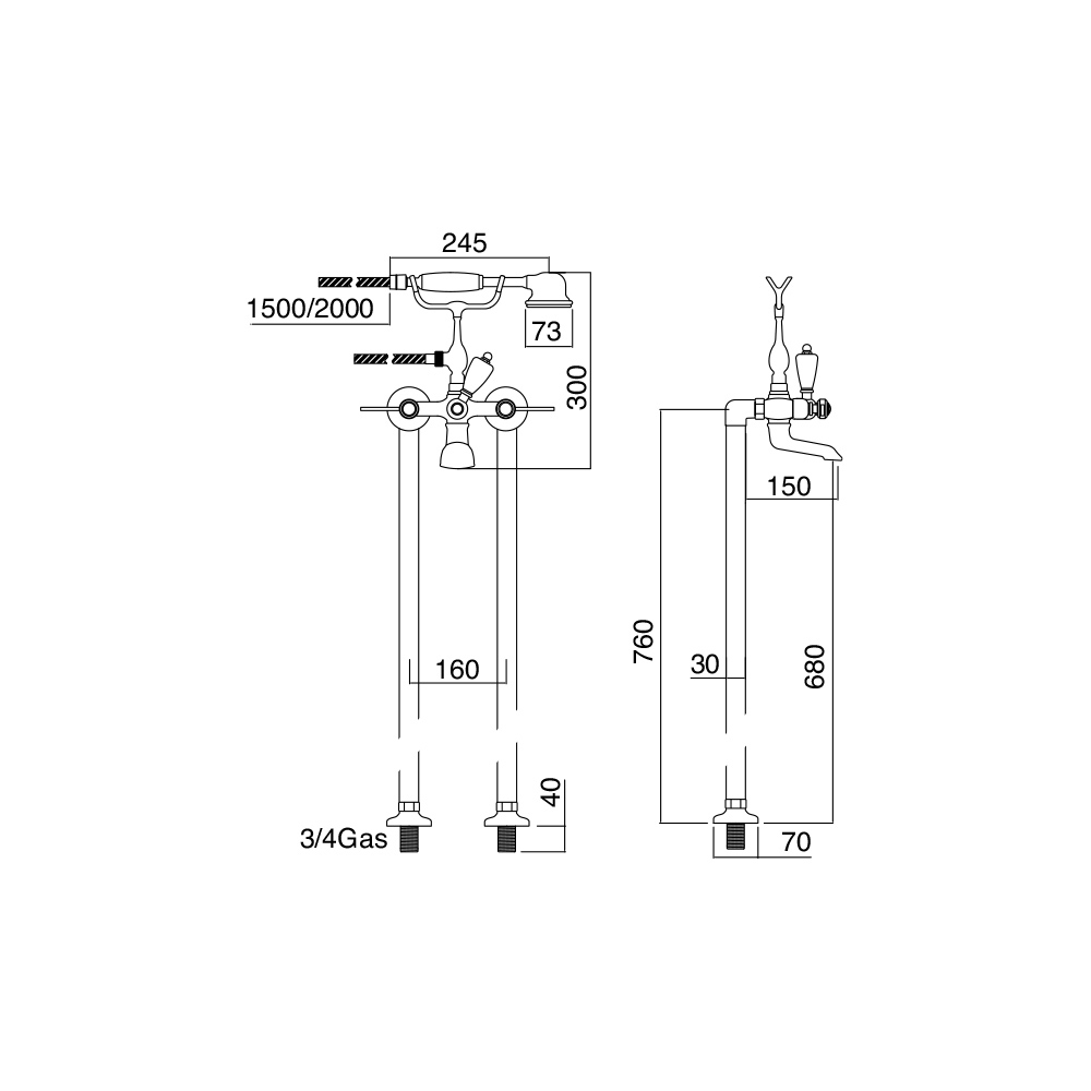 Höhe der Knöpfe mit Handbrause 30cm