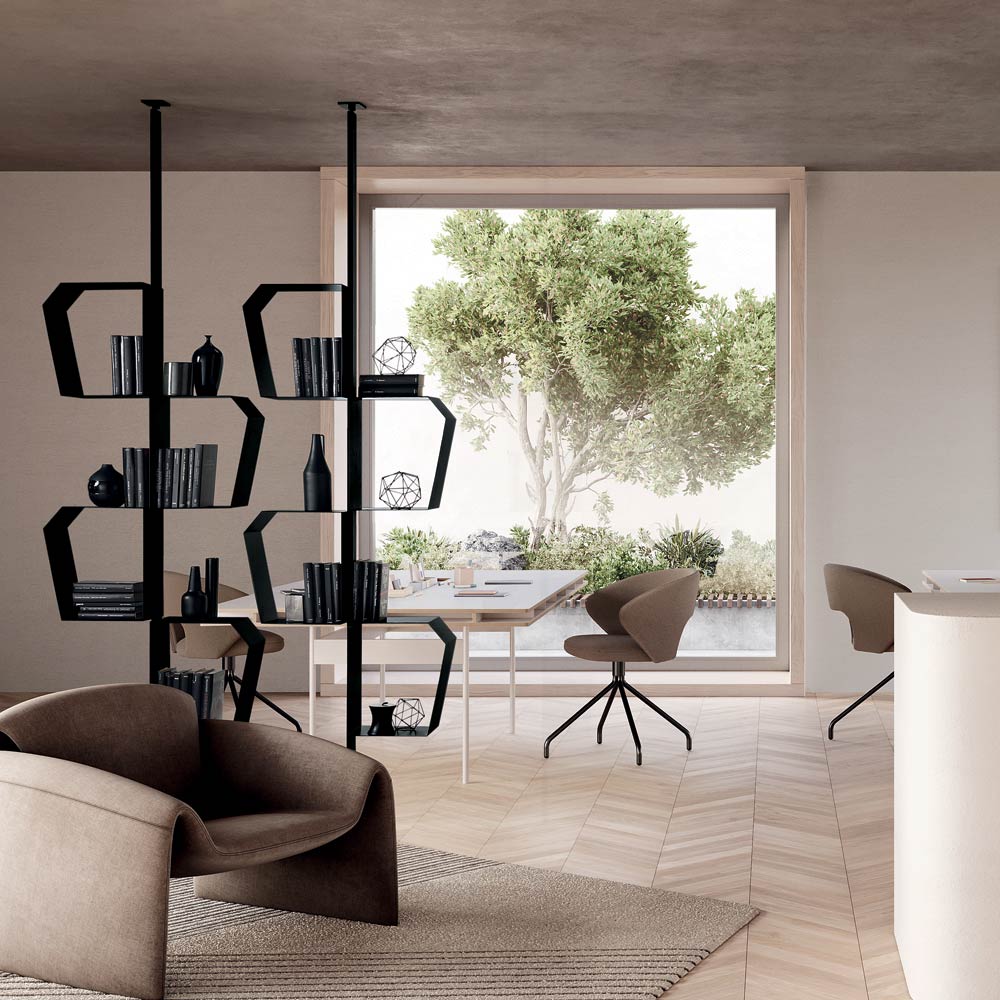 Dank seiner vielseitigen Konfigurationsmöglichkeiten lässt sich das Bücherregal sowohl an der Wand als auch an der Decke befestigen. In der Deckenversion kann es zudem als Raumteiler eingesetzt werden und eignet sich perfekt zur Abgrenzung von Räumen bei gleichzeitiger Wahrung optischer Leichtigkeit.
