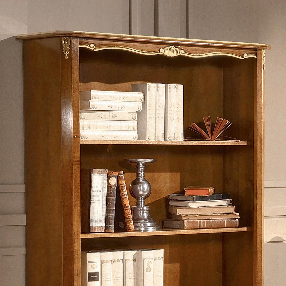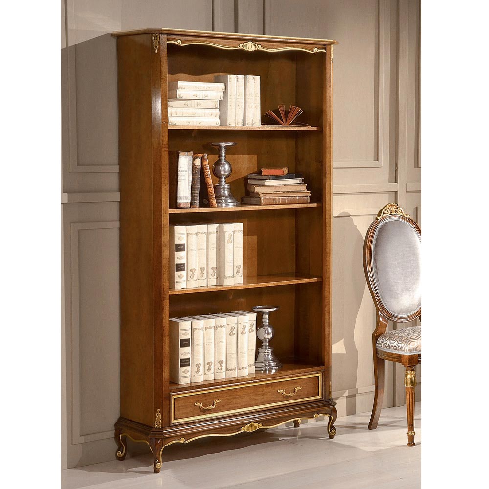 Dieses Bücherregal im klassischen Stil passt sich elegant in jede Umgebung ein und macht es raffiniert und effektiv. Er ist aus Bassano Nussbaumholz mit eleganten antiken Golddetails gefertigt und hat eine praktische Schublade und 3 Einlegeböden. Vollständig in Italien von erfahrenen Handwerksmeistern hergestellt, vollendet mit Weisheit und Geschmack für Eleganz. Die Herstellung erfolgt unter Verwendung hochwertiger Materialien und mit der größten Sorgfalt und Professionalität, die die Produkte Made in Italy auszeichnet .