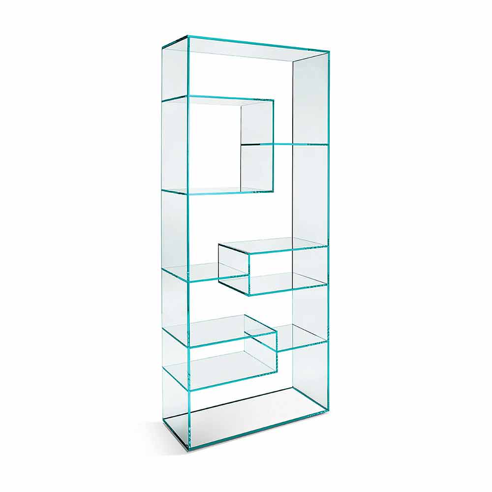 Freistehendes Wohnzimmer-Bücherregal aus extra klarem Glas mit oder ohne Schubladen made in Italy.