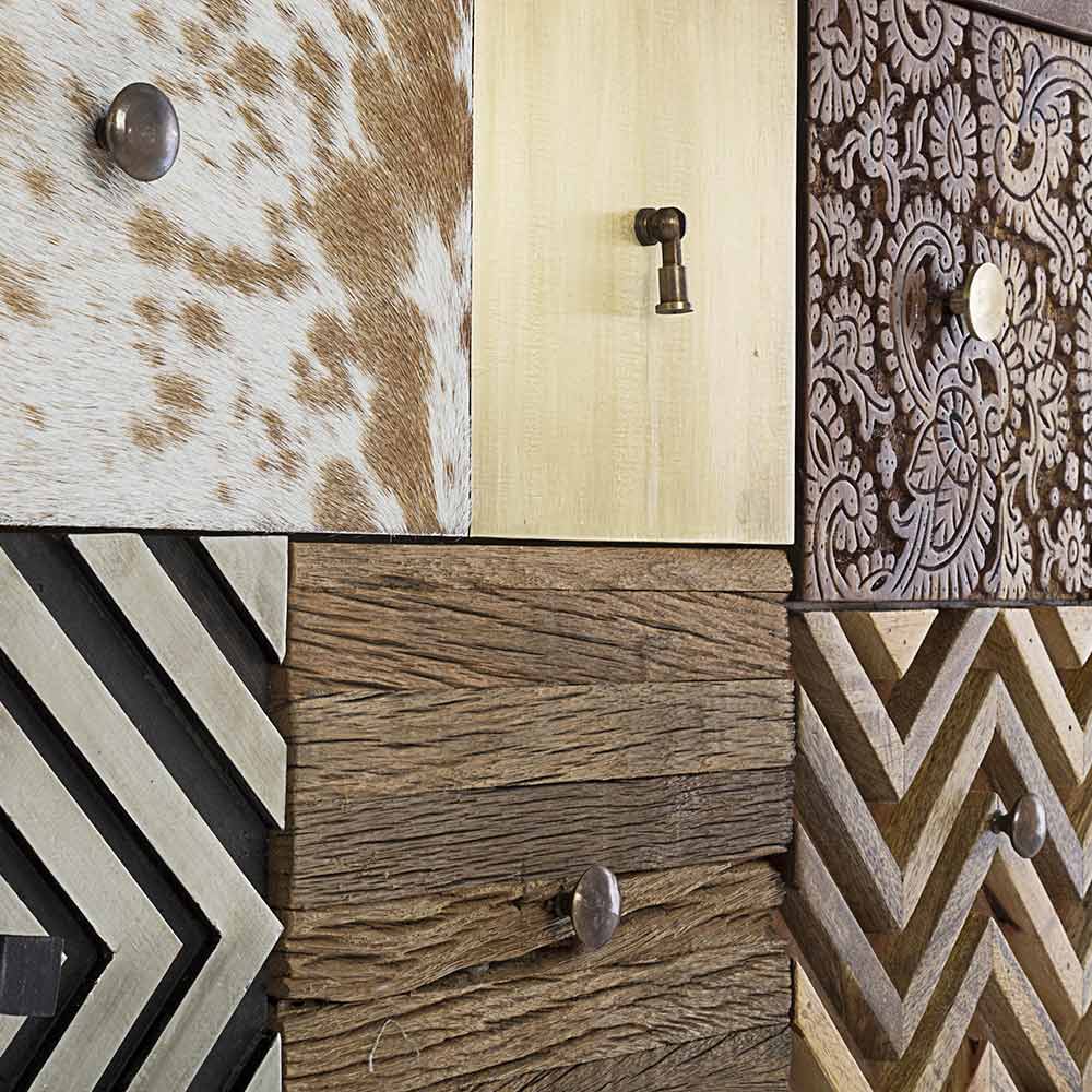 Die Front der Türen besteht aus recyceltem Mango- und Akazienholz mit wasserbasierter Lackierung.