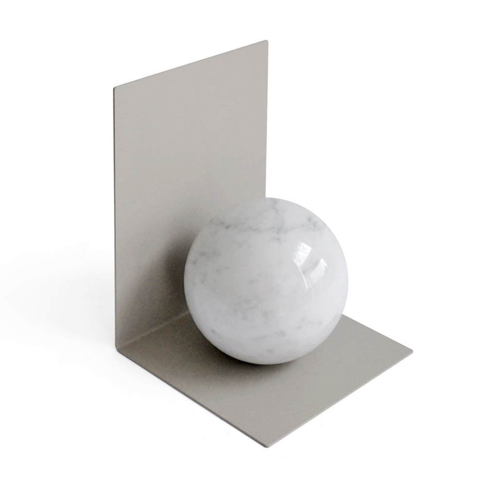 Diese Buchstütze aus Marmor ist die perfekte Synthese aus Funktionalität und moderner Skulptur . Das Design ist kühn minimalistisch, wobei eine Marmorkugel auf eine Metallplatte trifft und so ein optischer Kontrast entsteht, der eine wahre Augenweide ist.