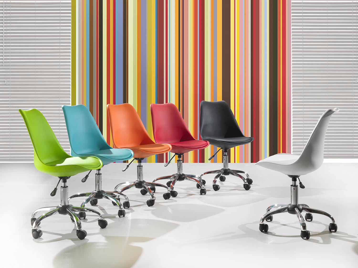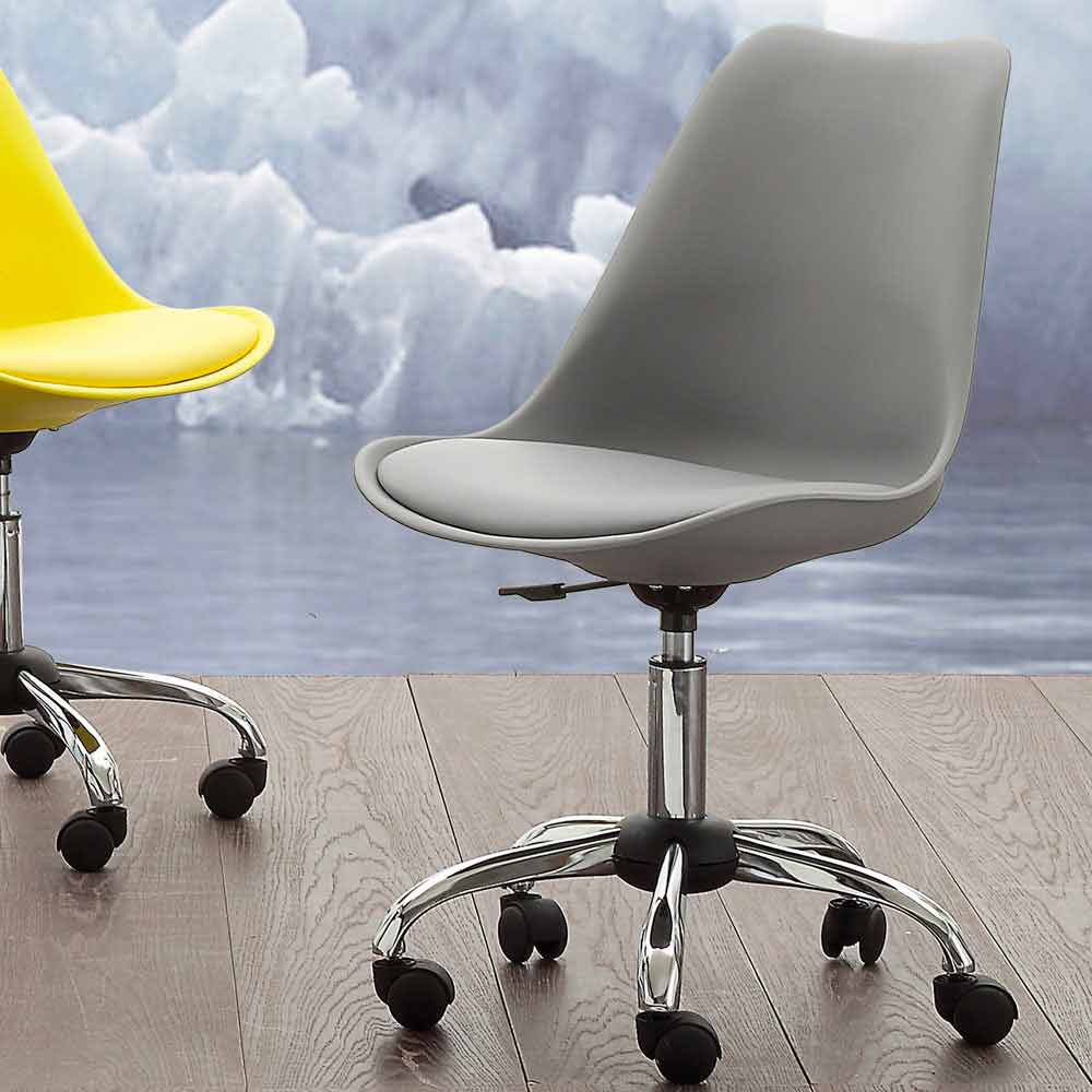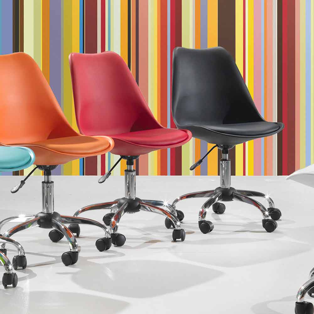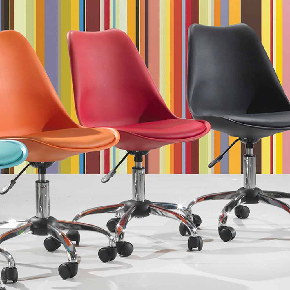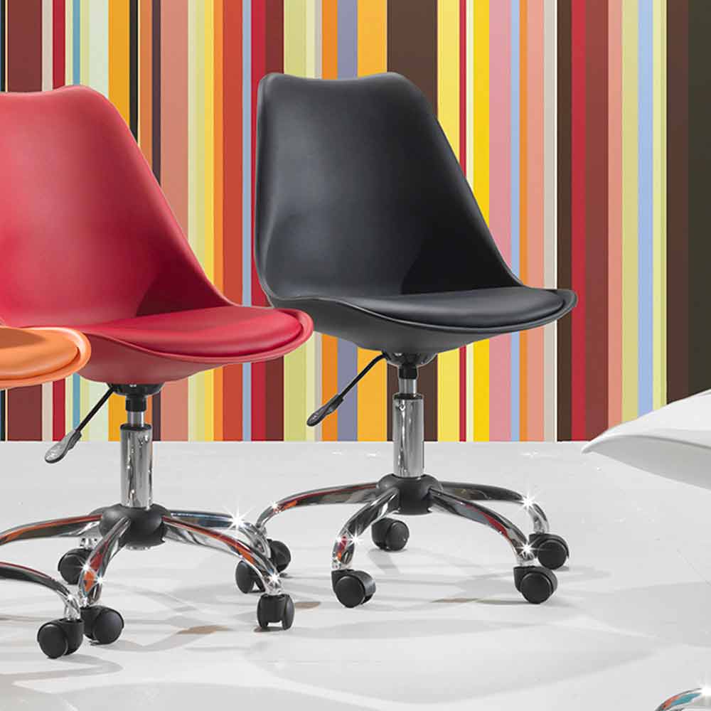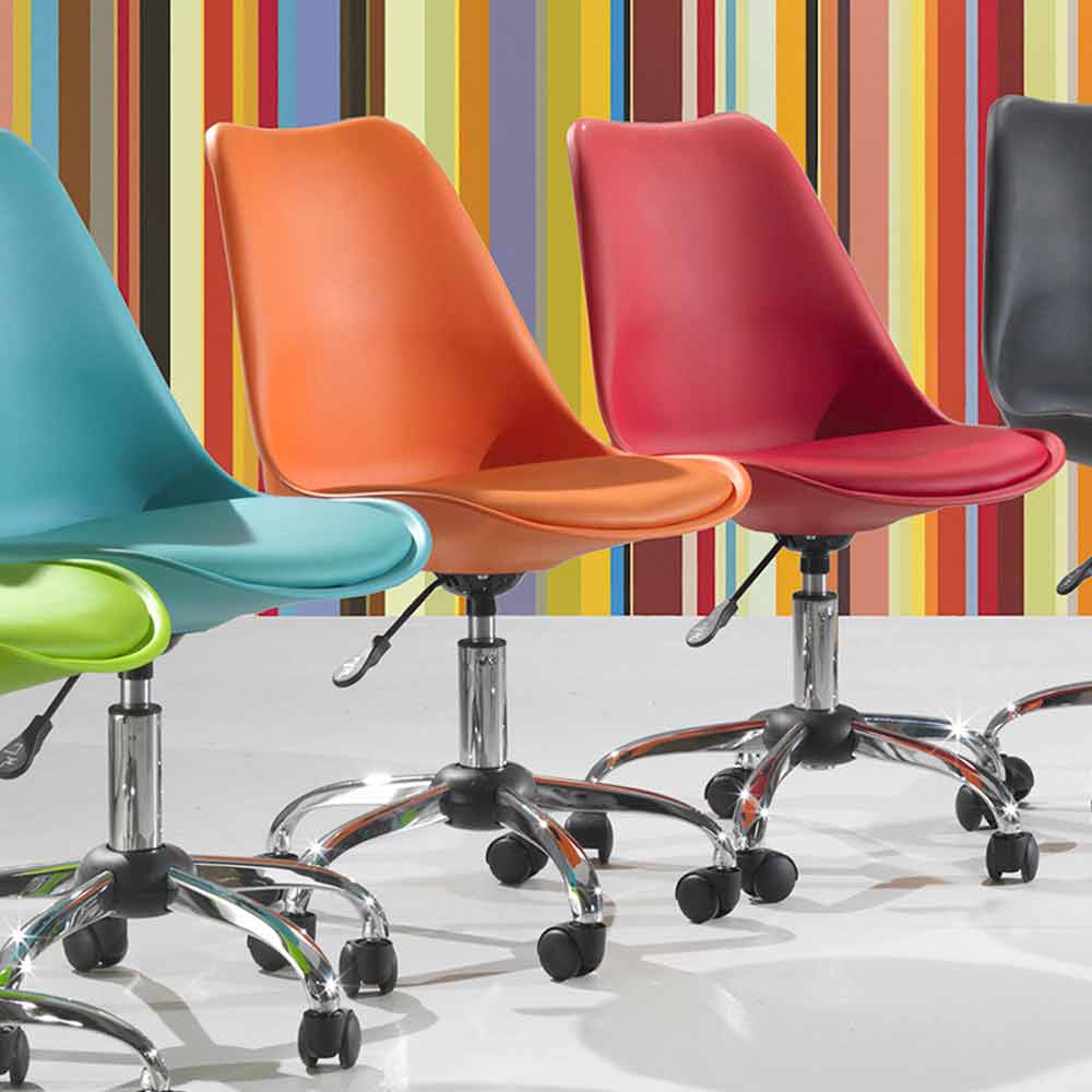 Bürostuhl aus farbigem Polypropylen und Untergestell aus verchromtem Metall mit Gasfeder.