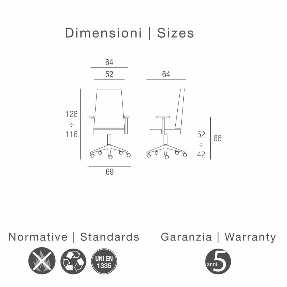 Der 5-Arm Fußkreuz sind aus glänzendem Aluminium hergestellt und der Stuhl hat selbst-bremsende Rollen aus Nylon Ø 65mm.