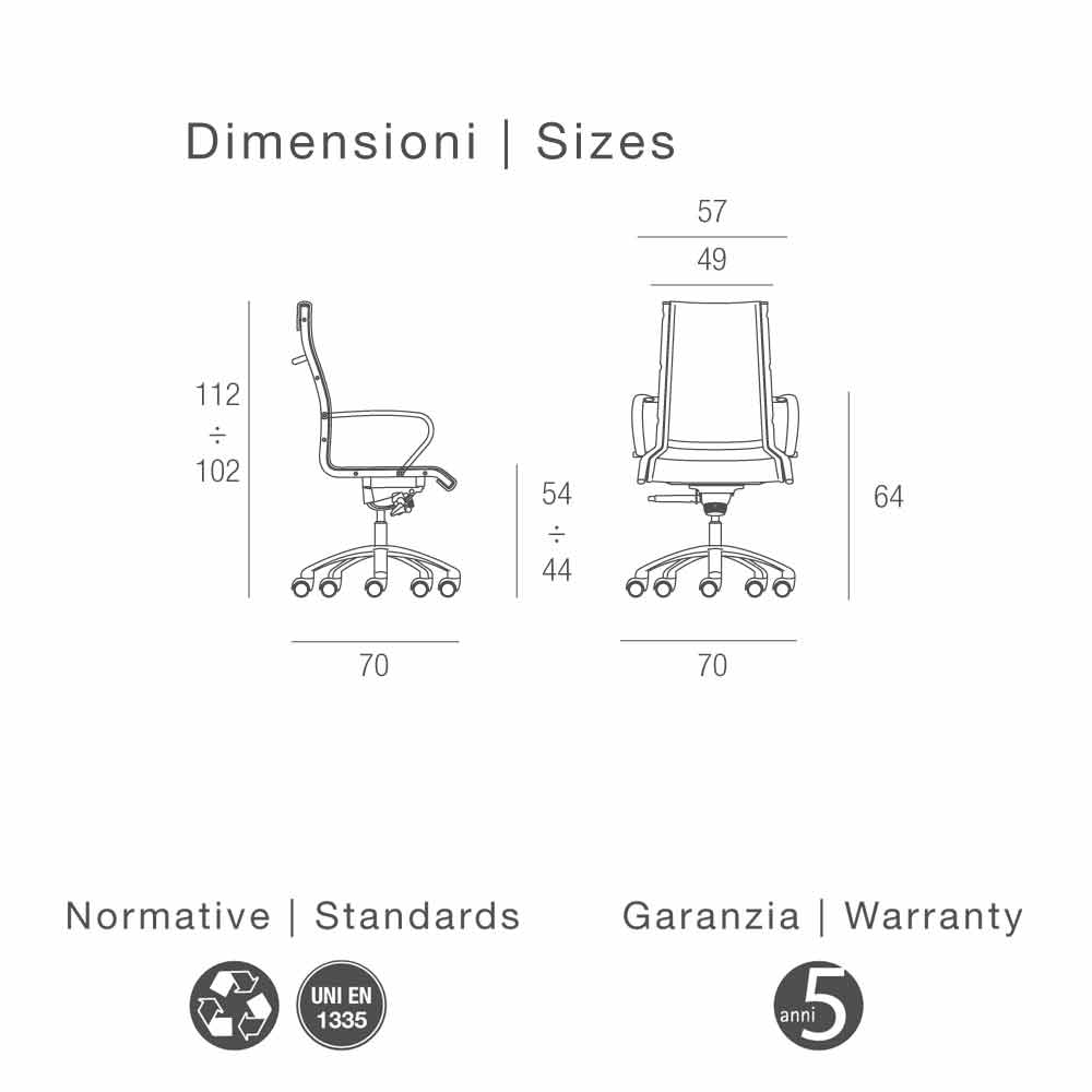 Die Armlehnen und der 5-Arm Fußkreuz sind aus verchromtem Aluminium und der Stuhl hat selbst-bremsende Rollen Ø 50 mm.