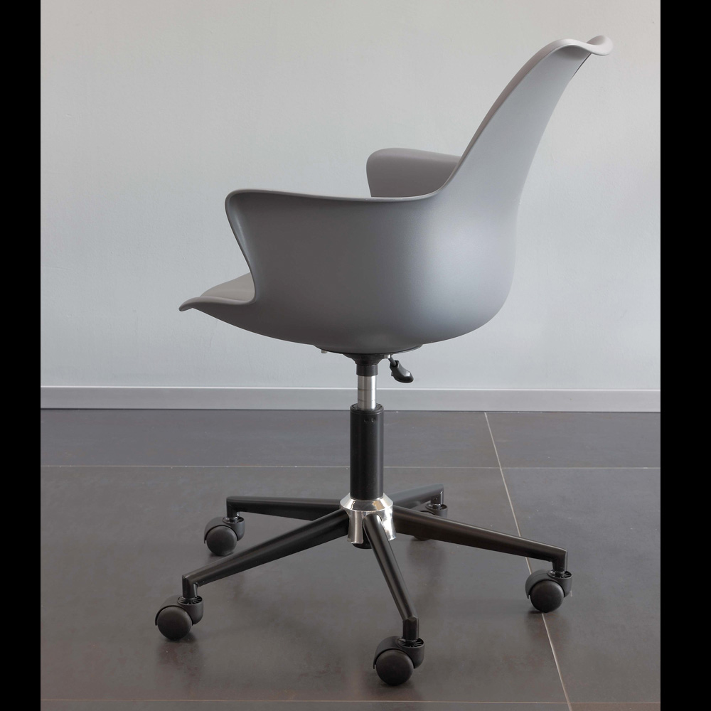 Polypropylen. Weiche und umhüllende Linien charakterisieren den Sitz dieses Stuhls, der Komfort und Bequemlichkeit bieten soll. Dank der Möglichkeit der Höhenverstellung und der drehbaren Räder ist es möglich, ihn besser an die unterschiedlichen Bedürfnisse der Person anzupassen und so zu einem bequemen und funktionellen Stuhl für jedermann zu werden.