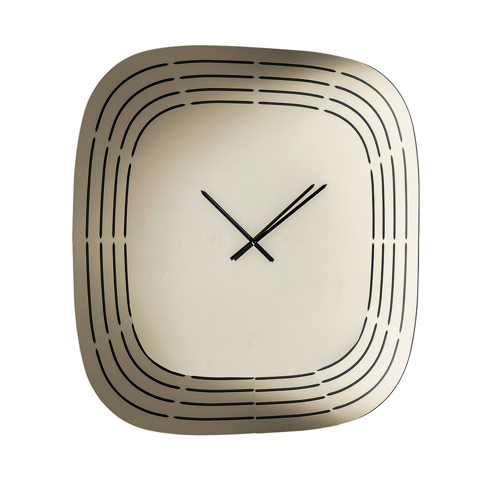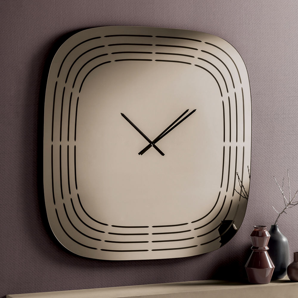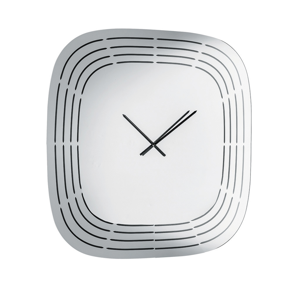 Die aus Spiegelglas gefertigte Uhr besticht durch ihre quadratische Form mit abgerundeten Ecken, die ihr ein weicheres, optisch ausgewogenes und modernes Erscheinungsbild verleihen. Die Oberfläche ist mit Lasergravuren verziert, die konzentrische Linien entlang der Kontur der Uhr zeichnen, in der Mitte Platz für die Zeiger lassen und so einen raffinierten grafischen Effekt erzeugen.