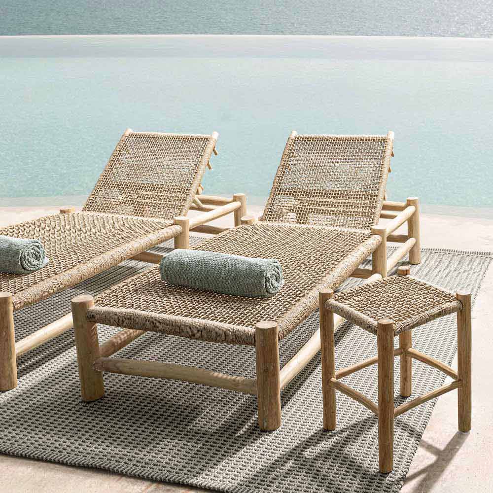 Liegende Chaiselongue im Freien aus Teakholz und synthetischen Fasern.
