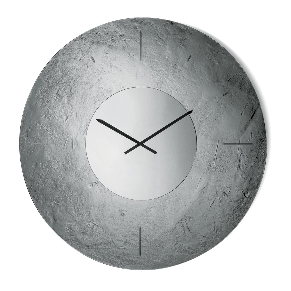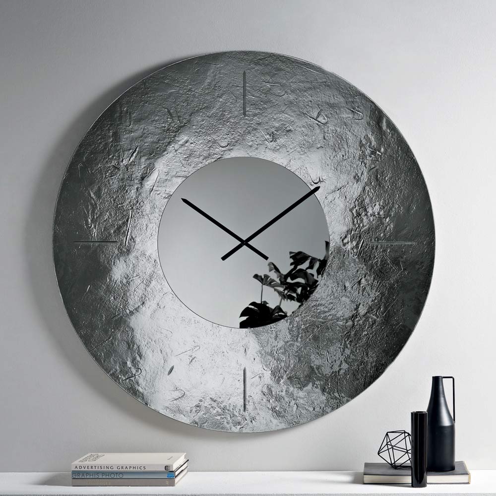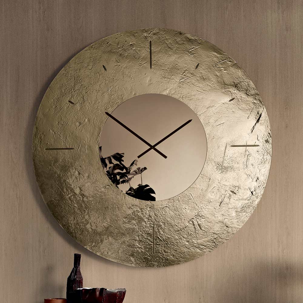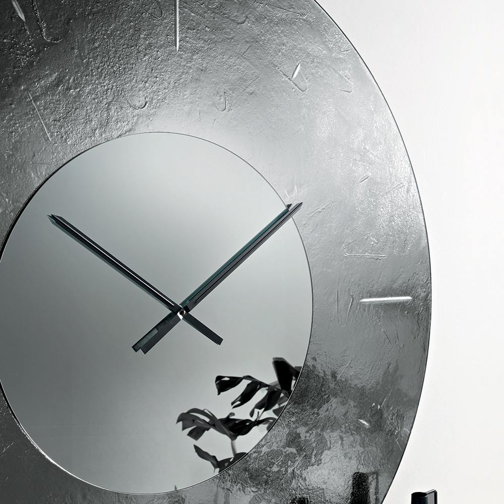 Die Uhr besticht durch ihre markante runde Form , die von einem rückseitig versilberten, gehämmerten Glasrahmen eingefasst wird. Dieser erzeugt ein raffiniertes Spiel aus Spiegelungen und Tiefe. In der Mitte befindet sich ein Ton-in-Ton verspiegelter Einsatz, der die Zeiger beherbergt und der Komposition Ausgewogenheit und Leuchtkraft verleiht.