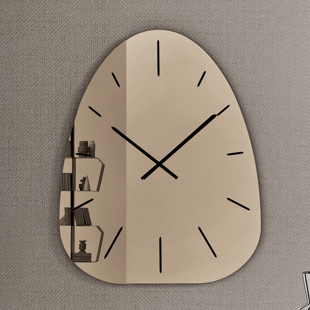 Die aus Spiegelglas gefertigte Uhr besticht durch ihre lasergravierten Ziffern , die dezent aus der reflektierenden Oberfläche hervortreten und ein raffiniertes Spiel von Licht und Tiefe erzeugen, das sich im Laufe des Tages verändert.