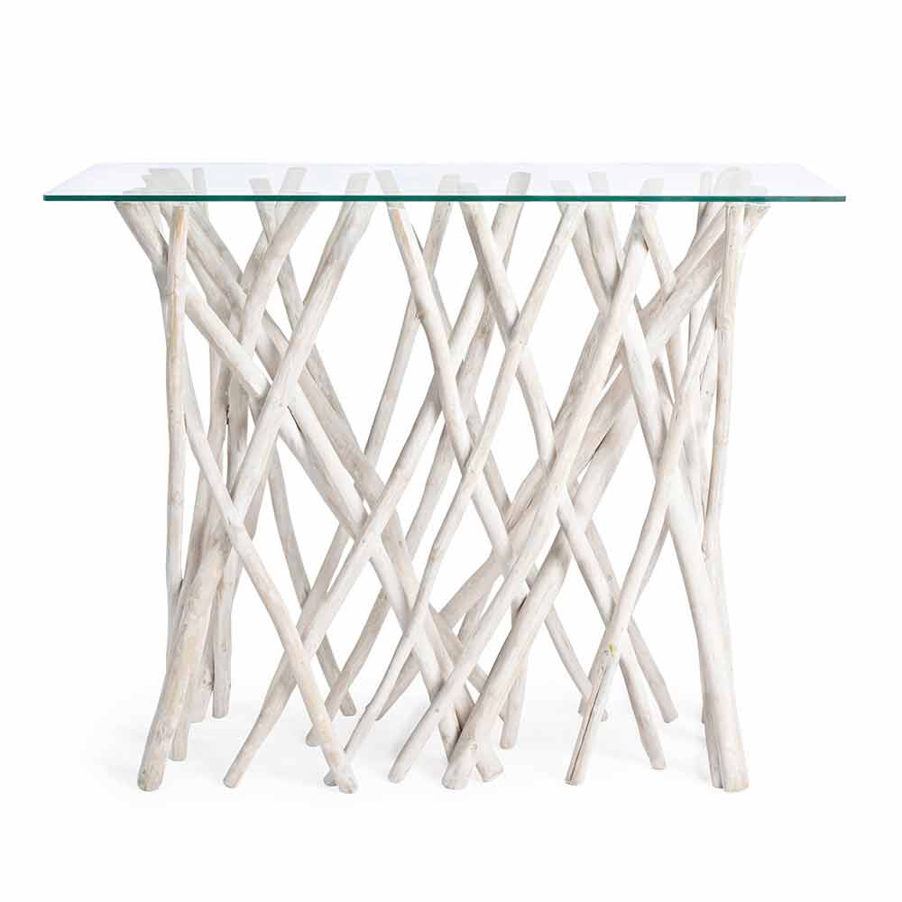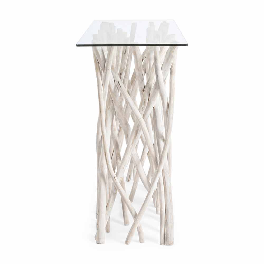 Diese Designkonsole besteht aus einer 8 mm dicken Platte aus ungehärtetem Glas, die von einer Basis aus gebleichten Teakholzästen mit natürlicher Oberfläche getragen wird.