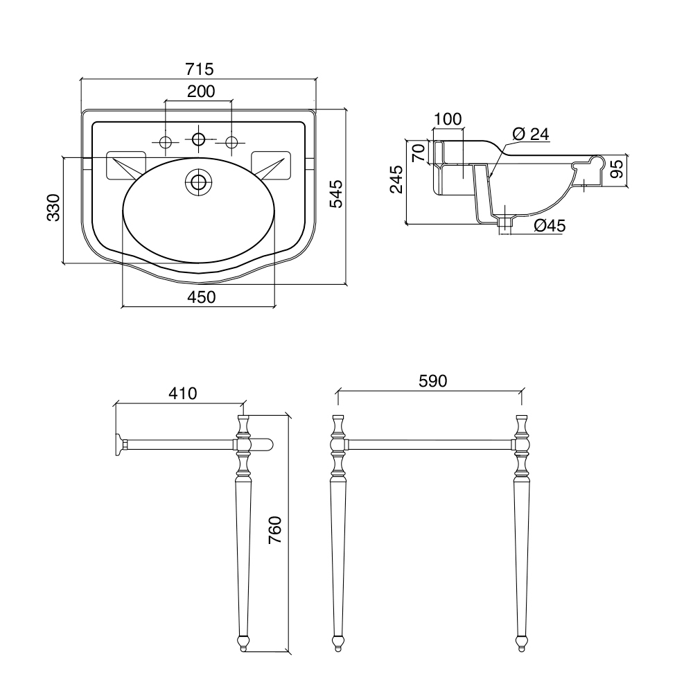 - Oberseite: L 71,5 x T 54,5 x H 24,5 cm, Sockel: L 59 x T 41 x H 76 cm, mit Einzelwaschtisch -Rückwand und Spritzschutzkante, 1 oder 3 Hahnlöcher – L 715 mm;