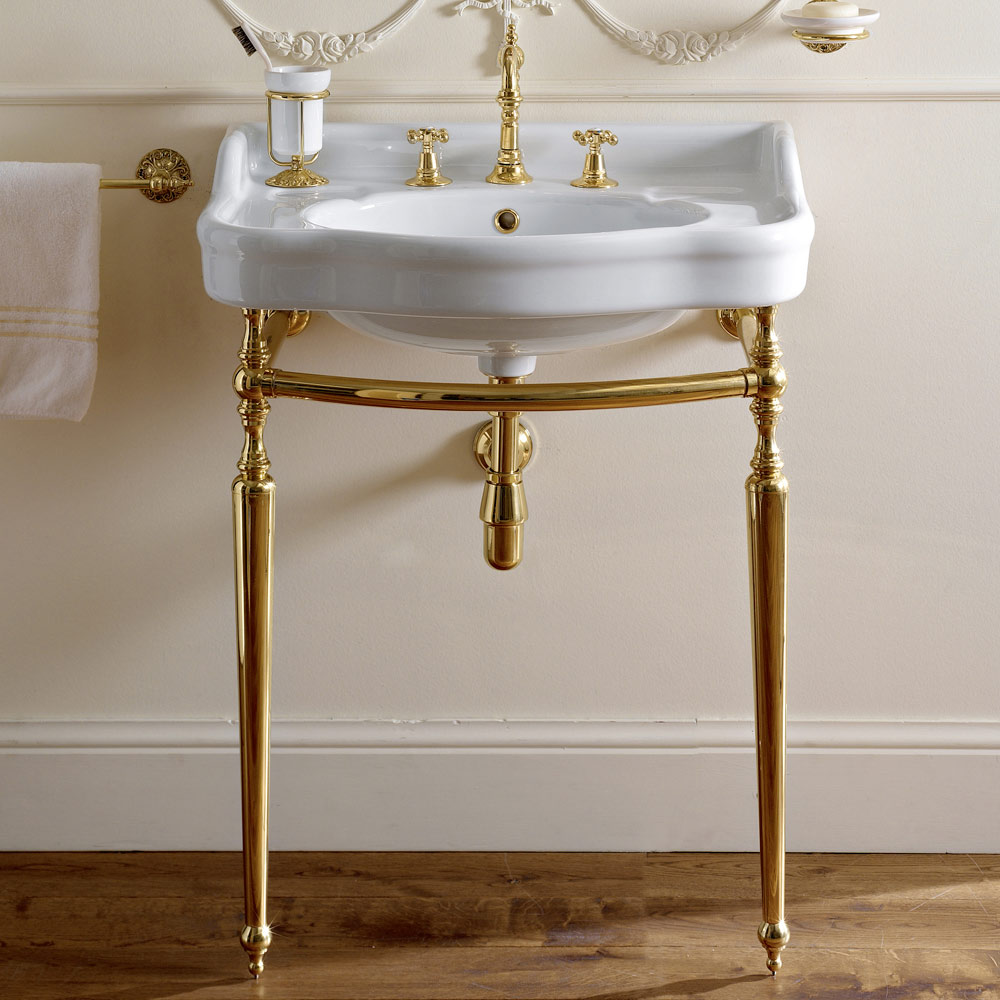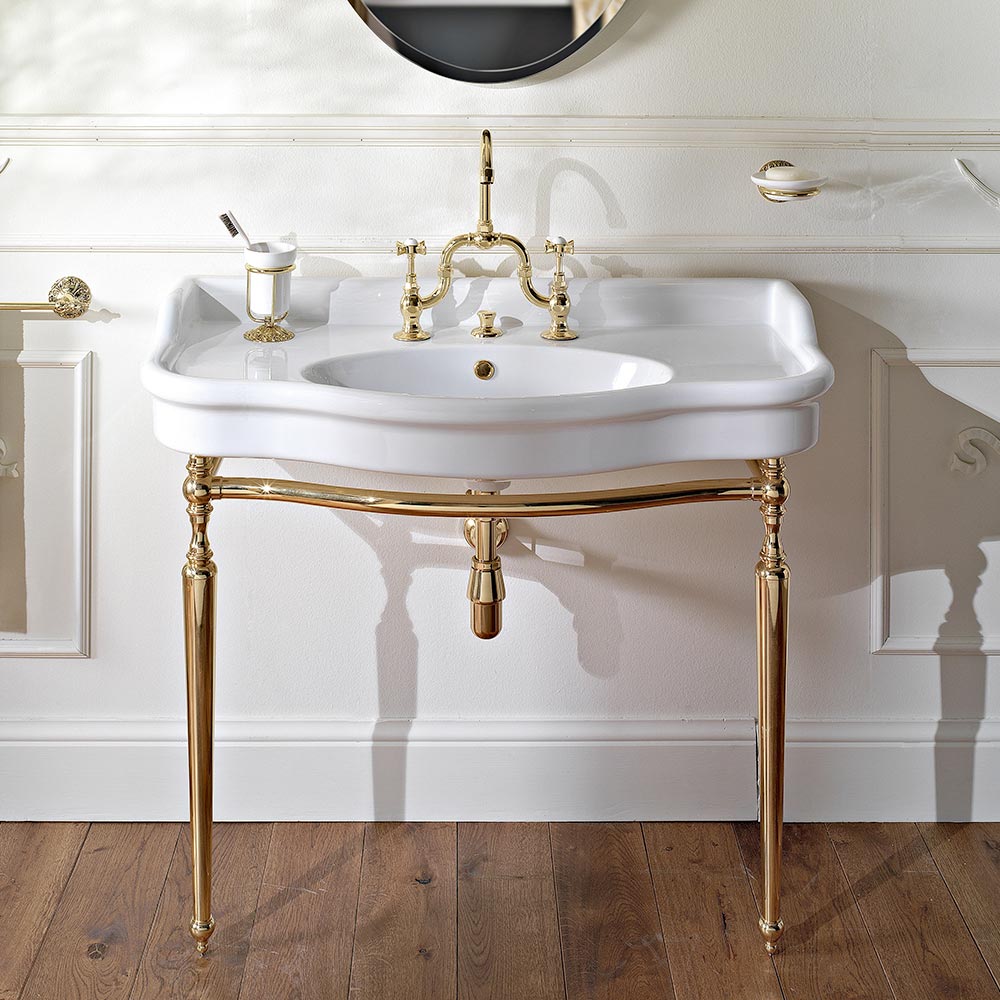 Vintage-Badezimmerkonsole mit Doppelschüssel aus weißer Keramik und Paulina-Metall, hergestellt in Italien.