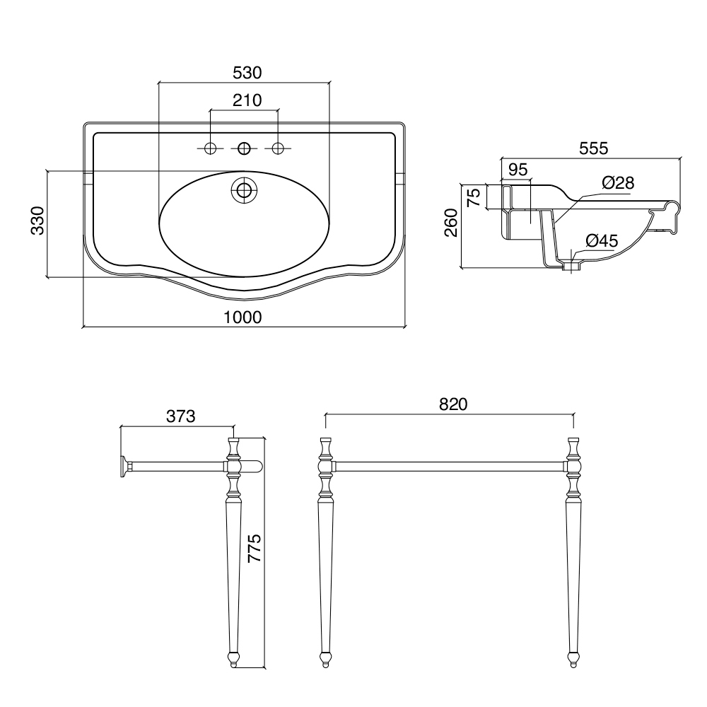 - Platte B 100 x T55,5 x H 26 cm, Sockel B 82 x T 37 x H 77,5 cm, mit Einzelwaschbecken mit Spritzschutz und Spritzschutz 1 oder 3 Hahnlöcher - L 1000 mm;