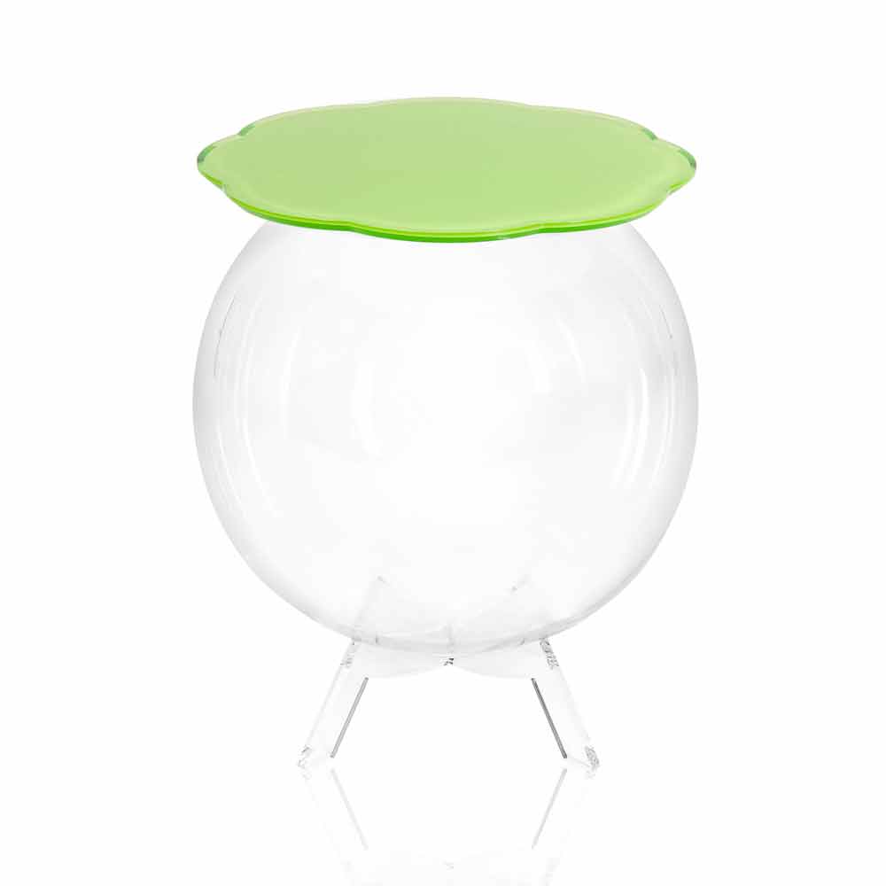 Couchtisch / runder grüner Biffy Container, modernes Design made in Italy Plexiglas Couchtisch / Container mit einer kugelförmigen Struktur, die als Vase für Blumenarrangements, als Aquarium, als Behälter für Spielzeug oder als Wäschekorb verwendet werden kann. Die Transparenz des BIFFY-Tisches macht ihn zu einem Stück mit einem unaufdringlichen Design, das leicht zu Hause angebracht werden kann. Das Regal besteht aus 100% PMMA-Plexiglas aus reinem grünen Polymer, das Plexiglas ist stoßfest, nicht verformbar, unveränderbar und wärmeisolierend. Die Helligkeit und Helligkeit werden über die Zeit konstant und unverändert beibehalten. Das PMMA Plexiglas aus reinem Polymer ist ungiftig, hypoallergen, geruchlos und antibakteriell. 100% recycelbar. Entworfen, entworfen und hergestellt in Italien, mit italienischen Materialien.