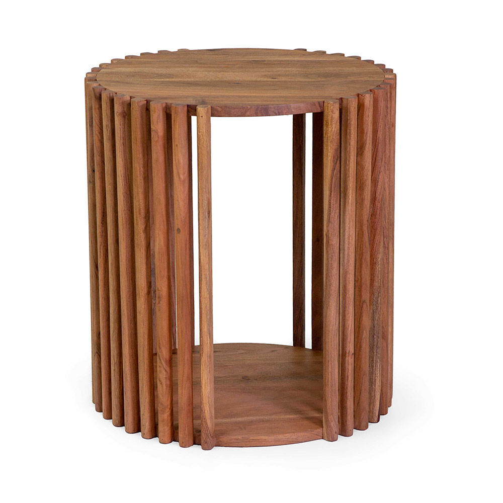 Das vertikale Lamellendesign erzeugt einen dynamischen und leichten visuellen Effekt, der perfekt ist, um jeder Umgebung einen Hauch von Originalität zu verleihen. Die runde und kompakte Form macht ihn ideal als Couchtisch, Nachttisch oder Einrichtungsaccessoire für gemütliche Ecken.